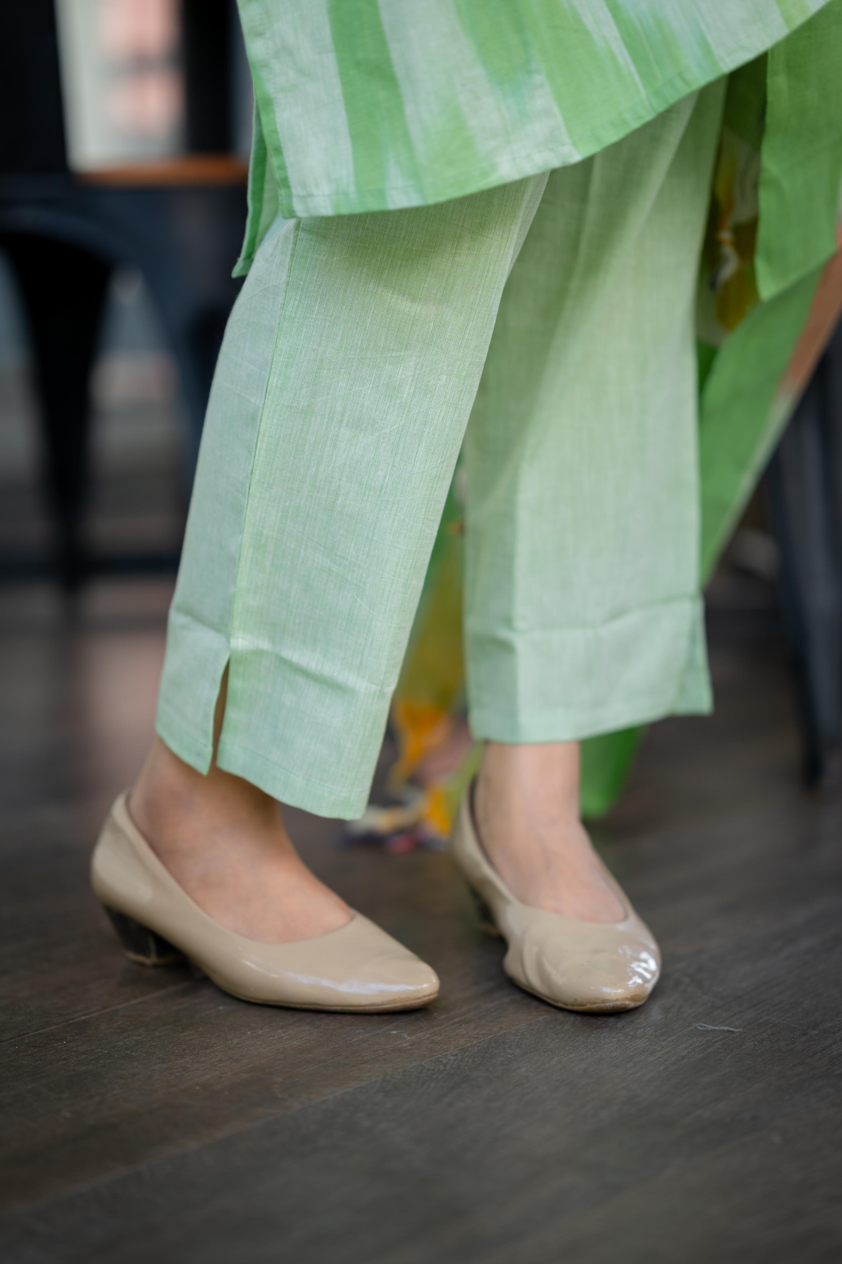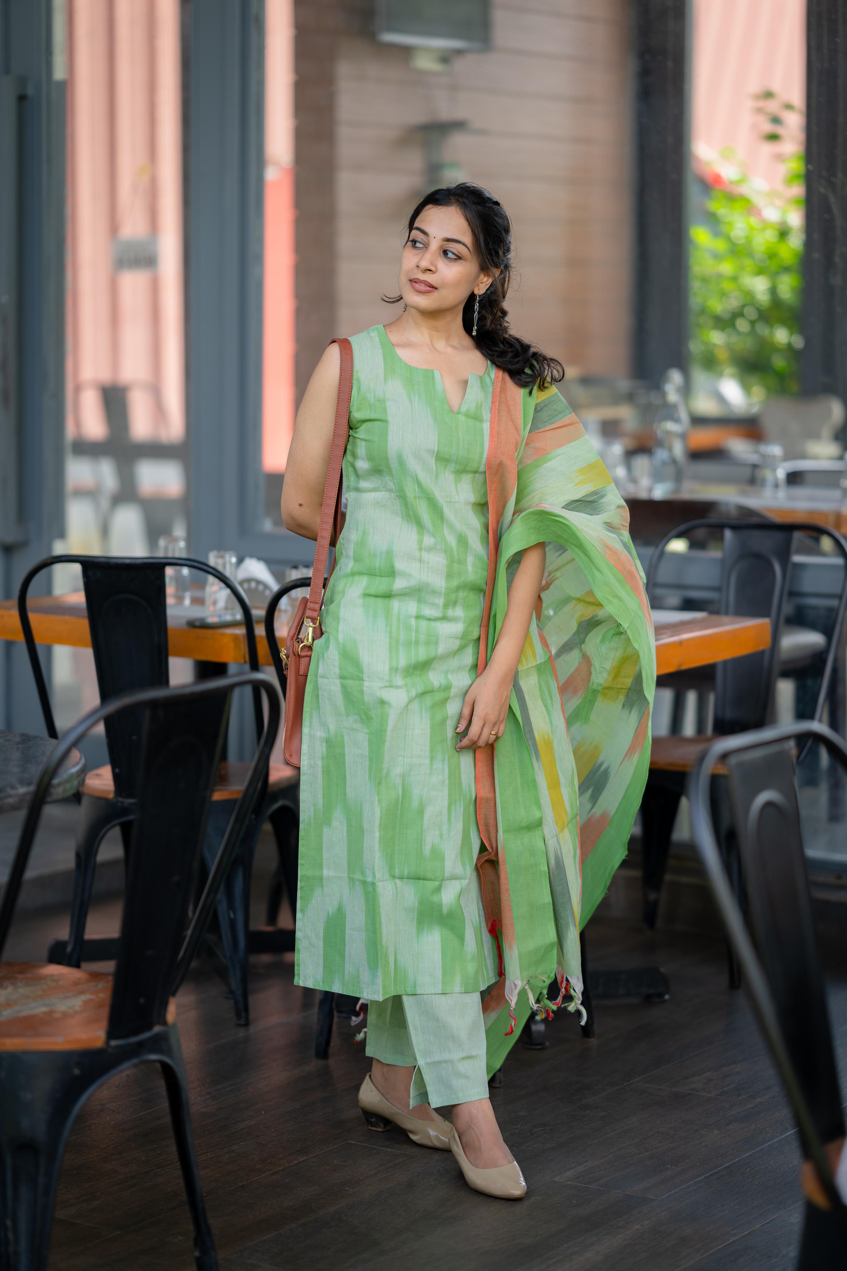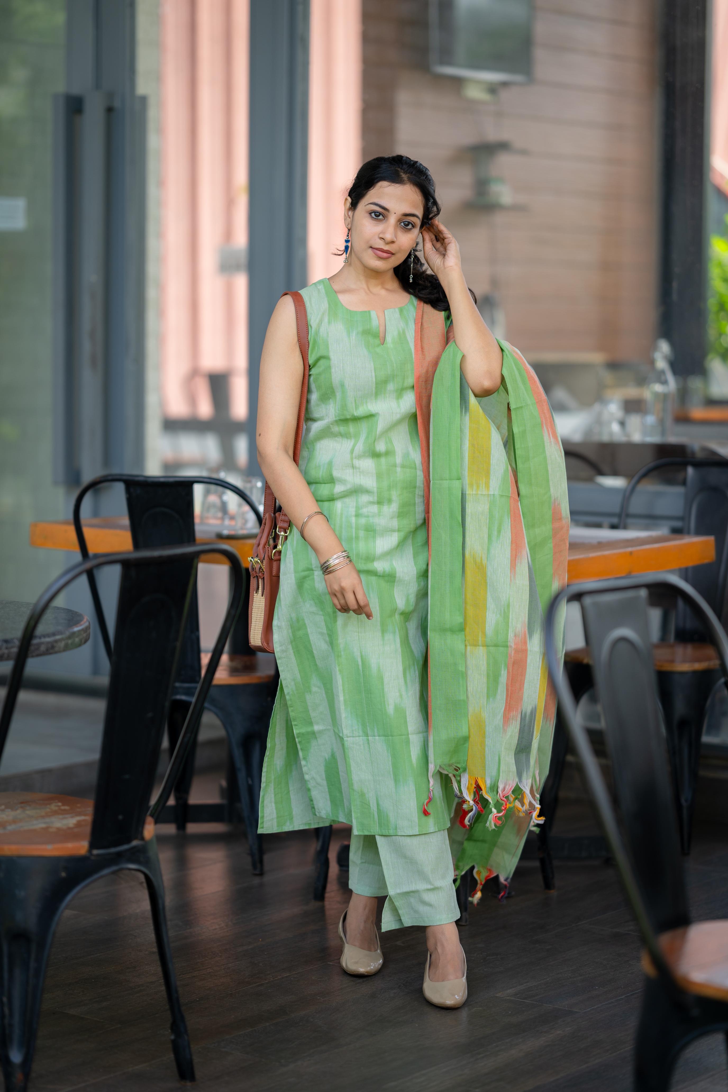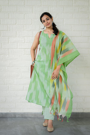 Kalki ( green ) - ikat handloom cotton suit set with dupatta in green colour