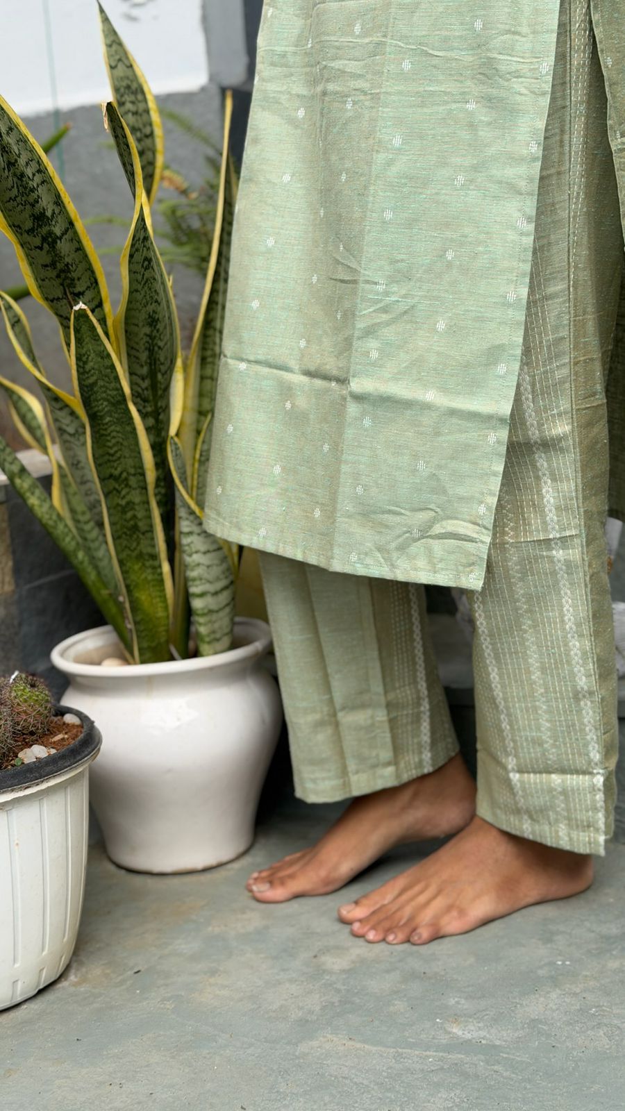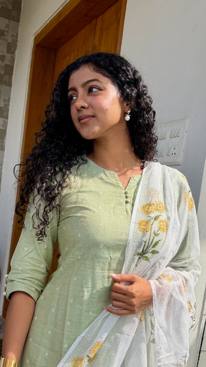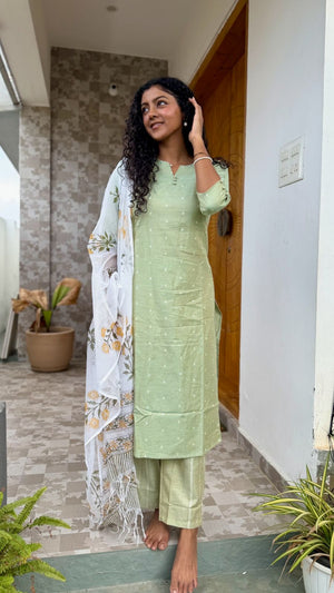 Linen cotton flex kurta set in green with 3/4th sleeves for the kurta with matching linen cotton flex trousers with functional pockets. Complimenting white kota doria dupatta with mughal handblock prints all over with tassels.