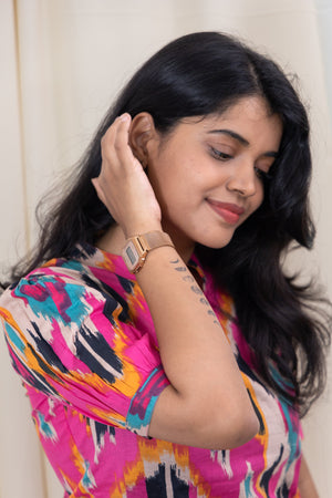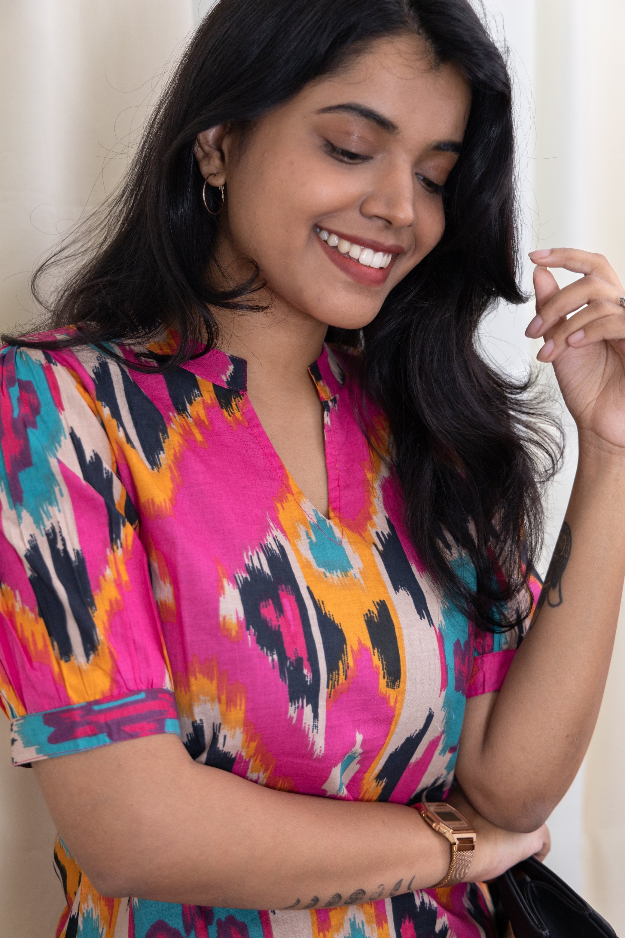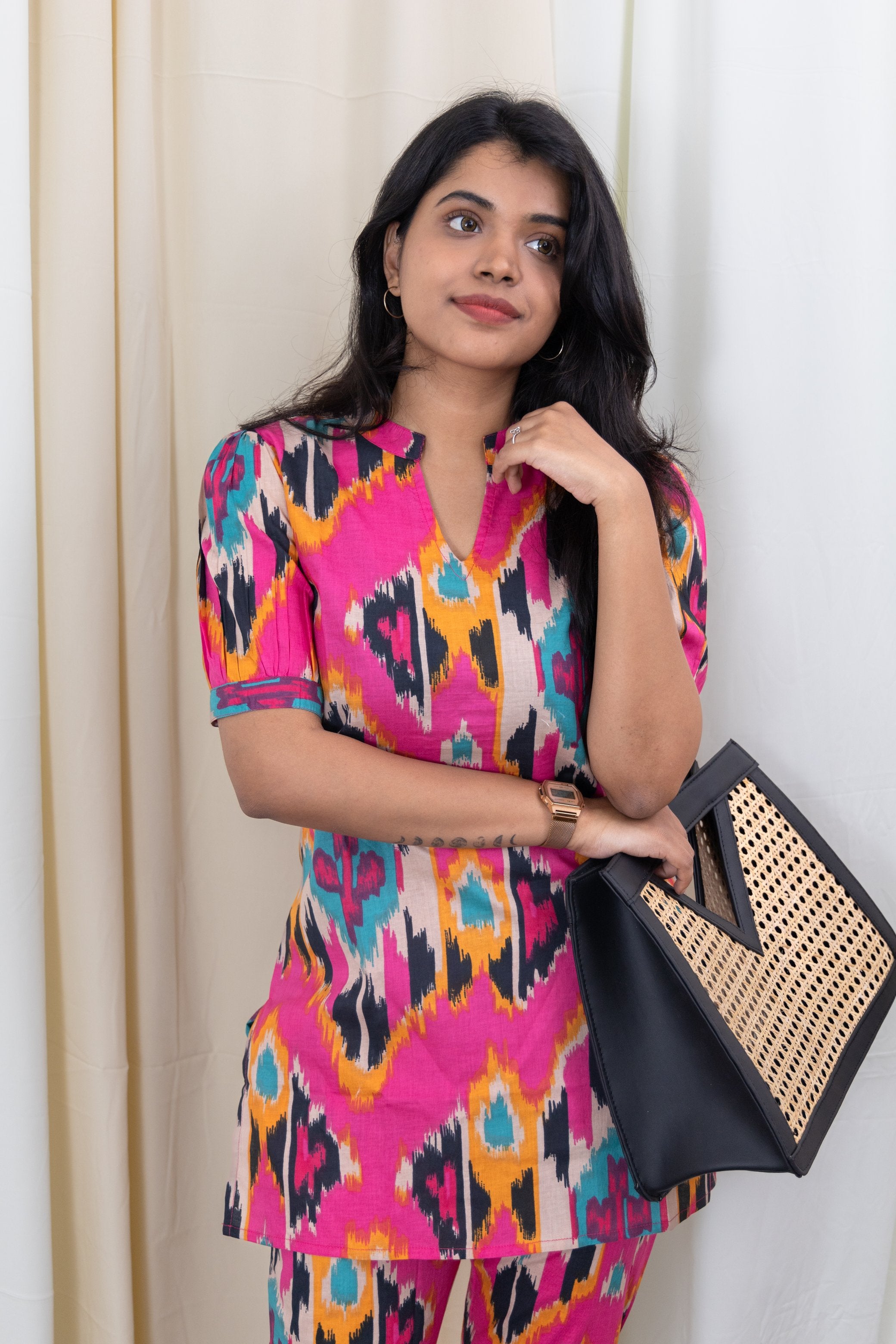 This pink colour coord set with dramatic sleeves is a playful and quirky matching coord set that exudes style and comfort. Made of pure organic cotton, it offers a great fit and allows you to move freely. Perfect for those who want to stand out with a touch of sass and humour. The pants have functional pockets too.