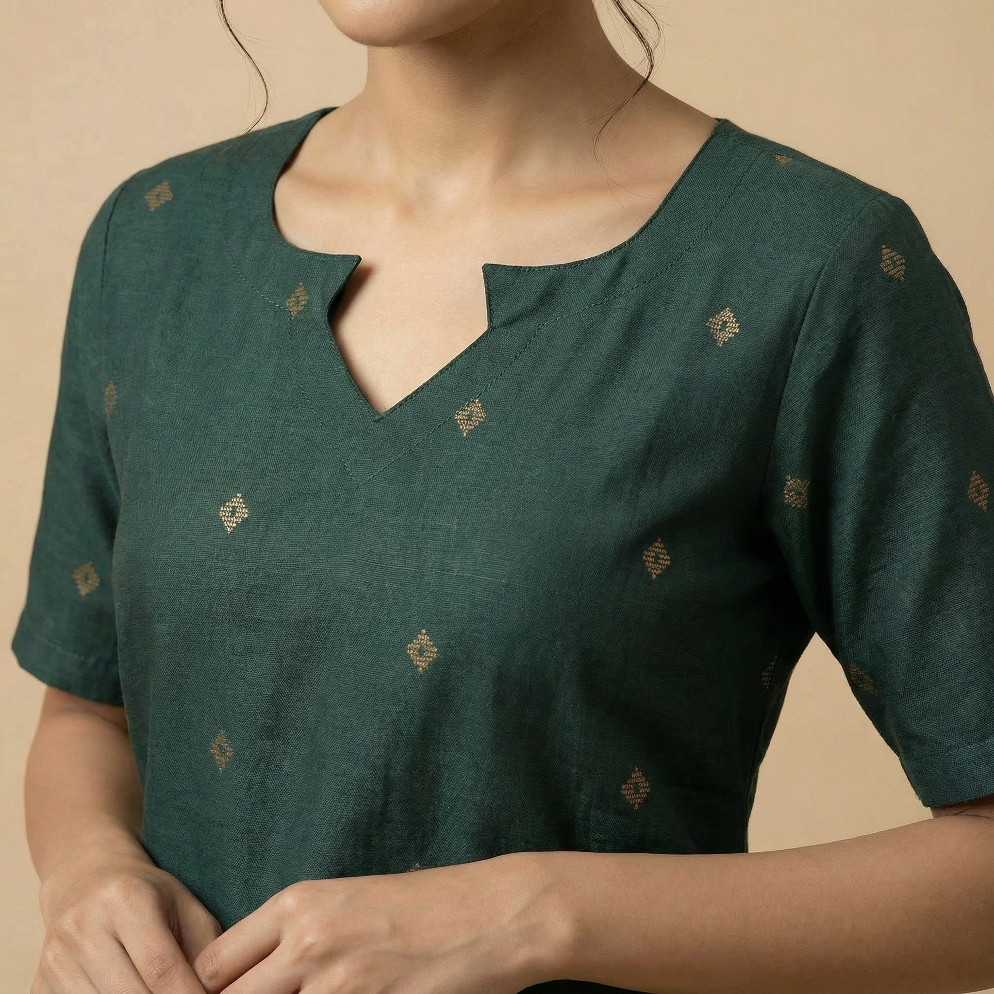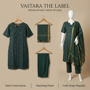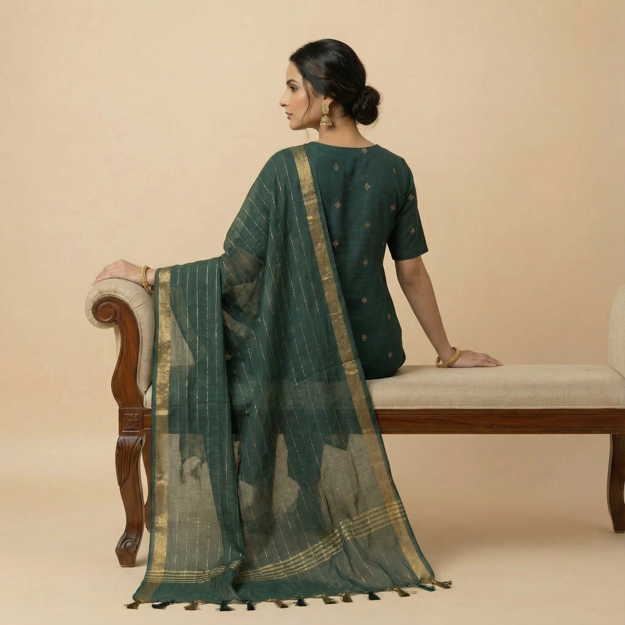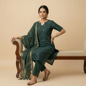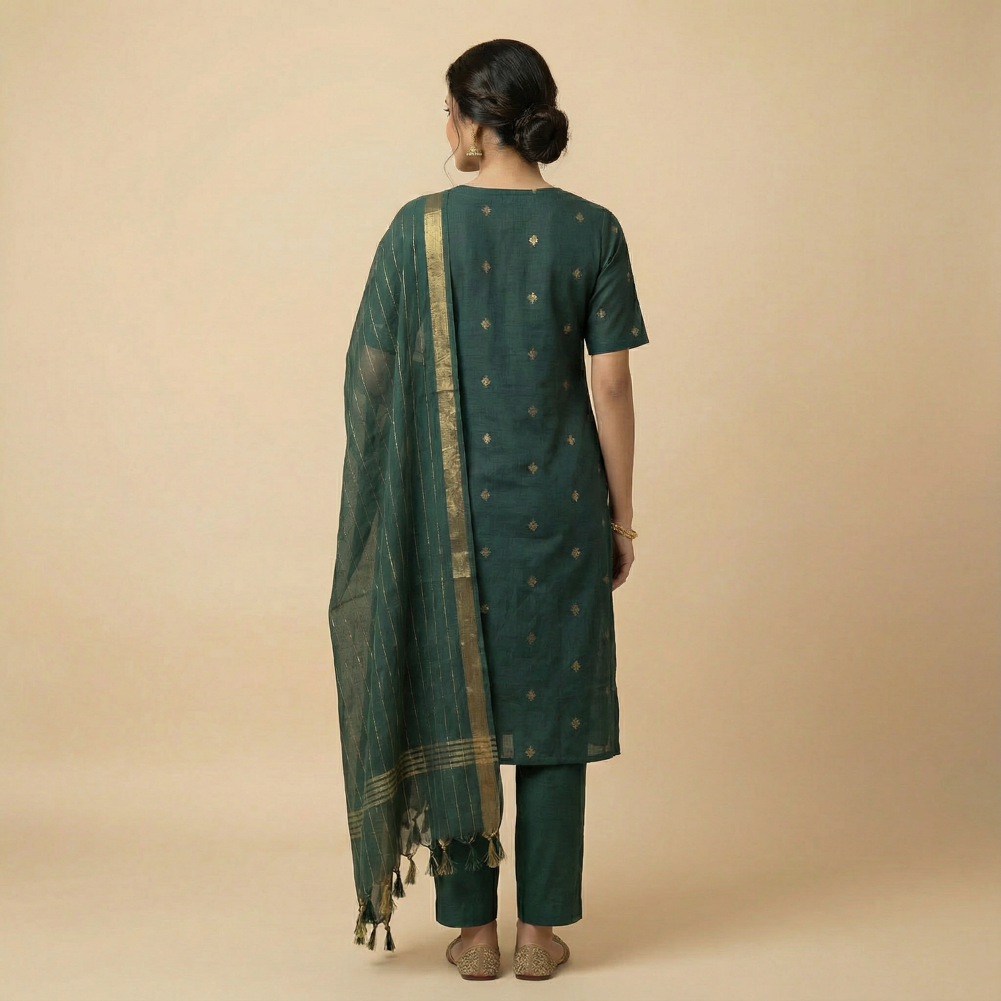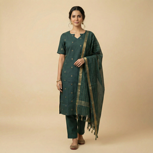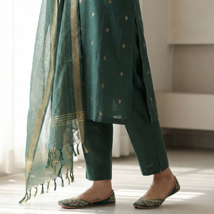 — Pure handloom cotton suit set with golden zari buttas all over the kurta, with smart sleeves and neck detailing. Matching plain handloom cotton trousers with functional pockets and complimenting zari striped dupatta to oomph the over look of the ensemble.