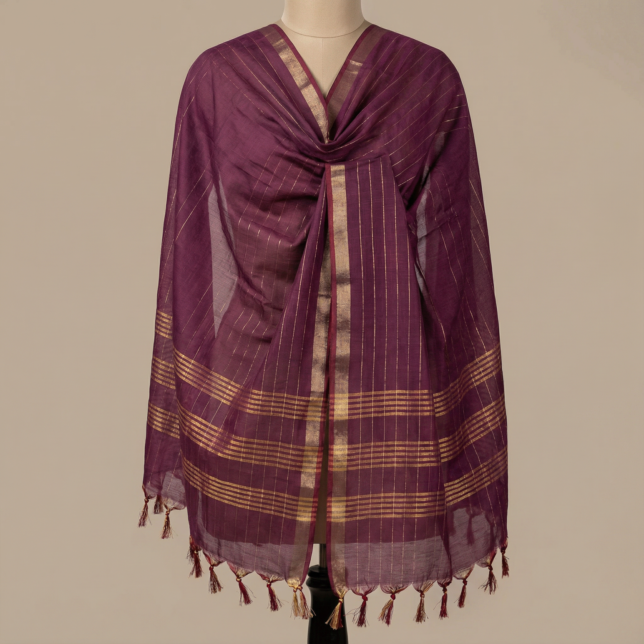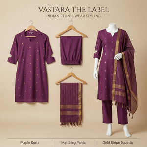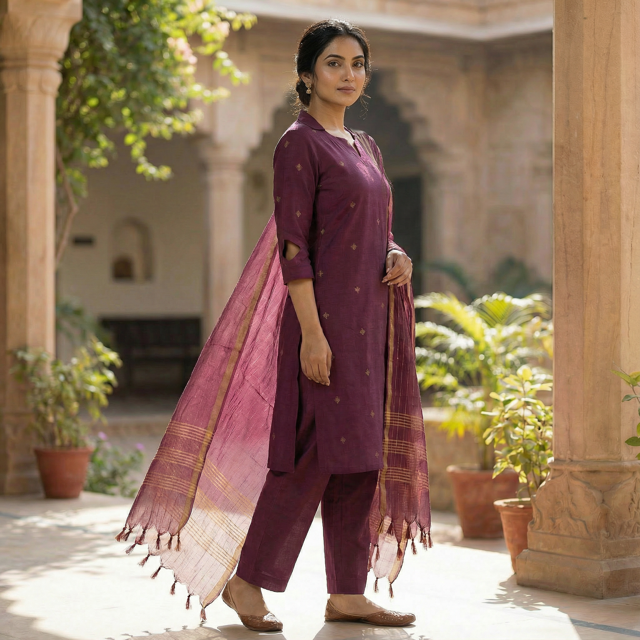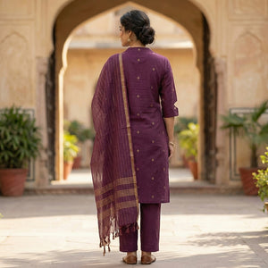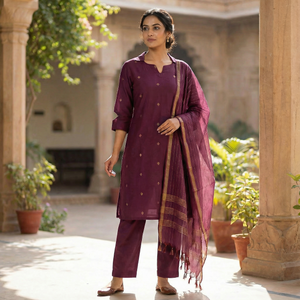 — Pure handloom cotton suit set with golden zari buttas all over the kurta, with smart sleeves and neck detailing. Matching plain handloom cotton trousers with functional pockets and complimenting zari striped dupatta to oomph the over look of the ensemble.