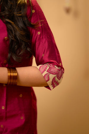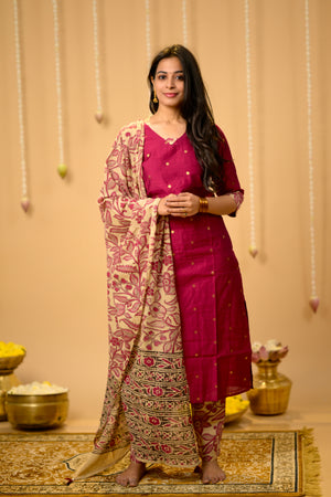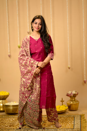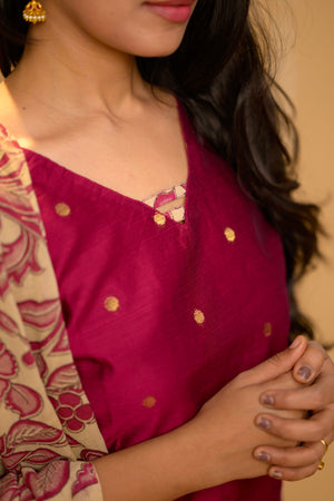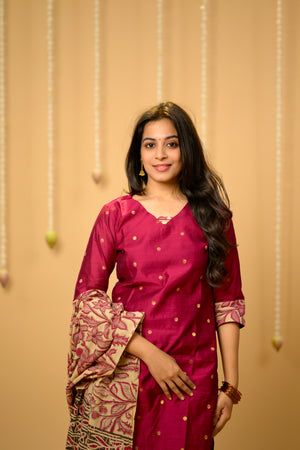 Kothai (pink) - handloom silk by cotton suit set with hand painted kalamkari dupatta in pink