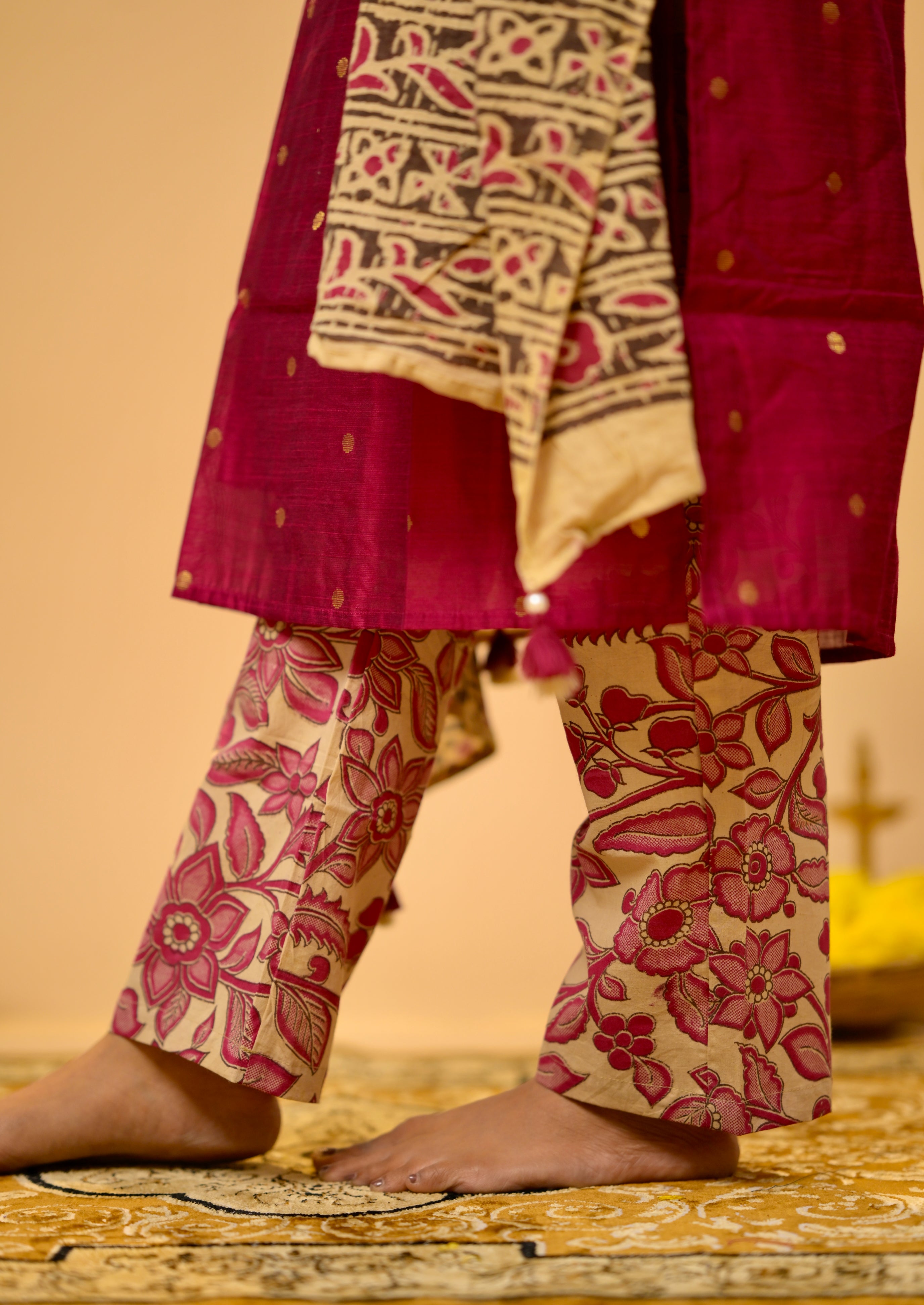 Complimenting hand painted kalamkari cotton trousers with functional pockets and matching hand painted kalamkari cotton dupatta.
