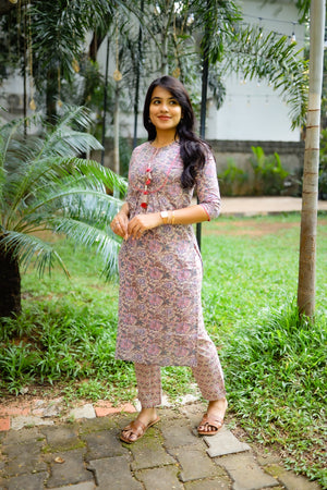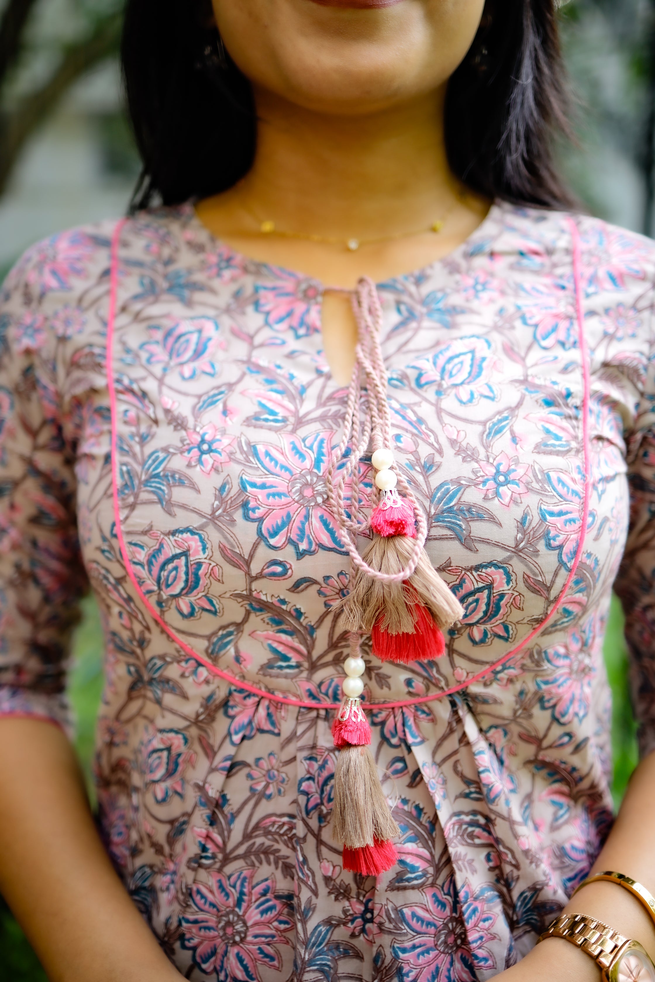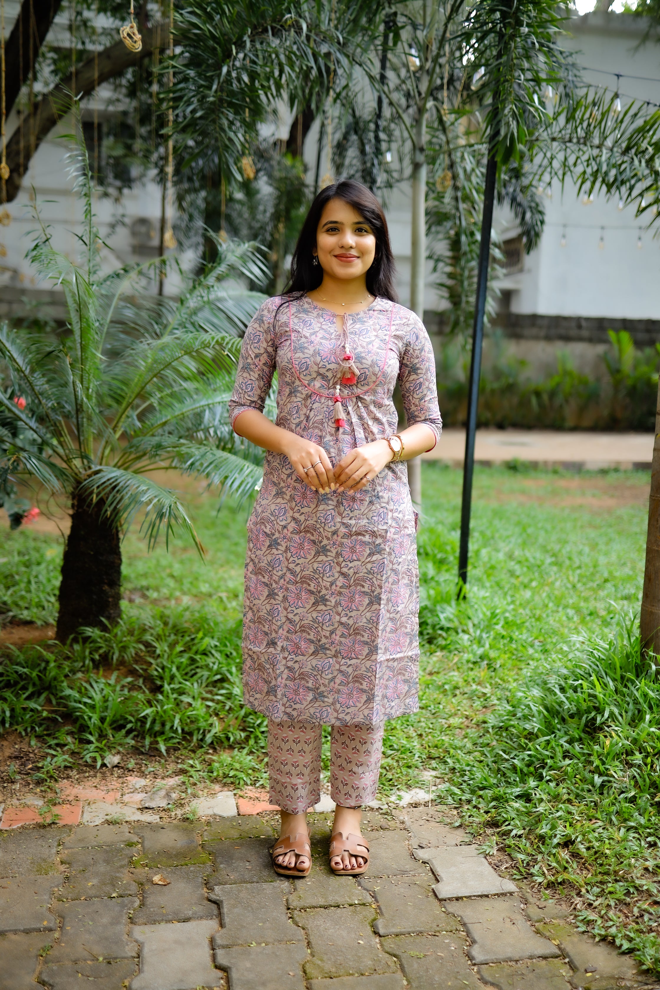 — Jaal handblock printed cotton 2 pc kurta set with a smart neckline with handmade colourful tassels, 15 inch sleeves. The matching trousers come with functional pockets.