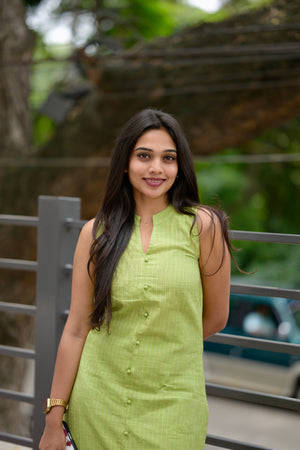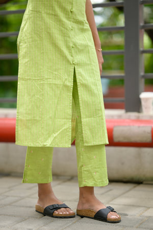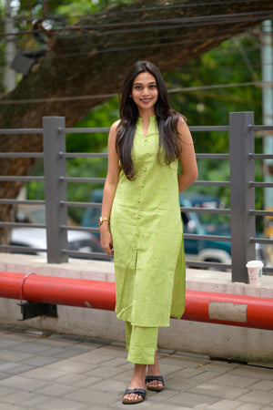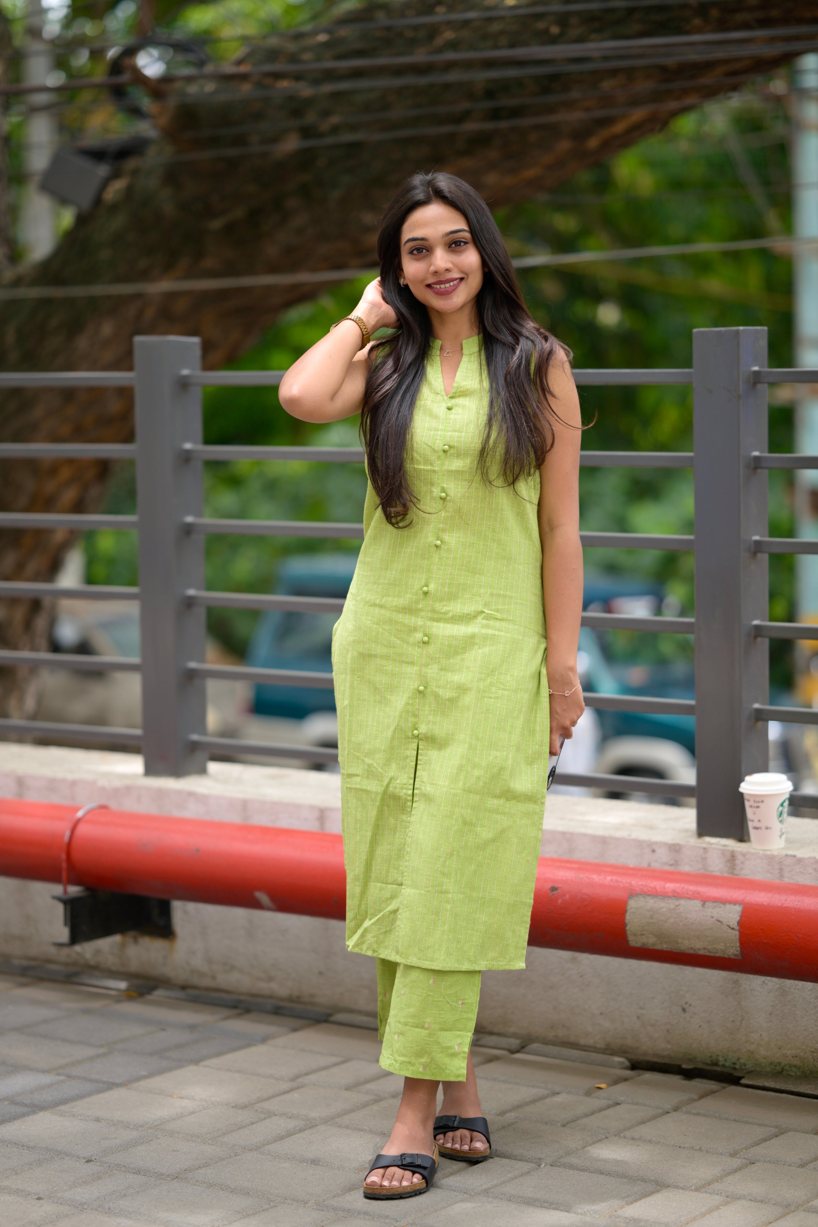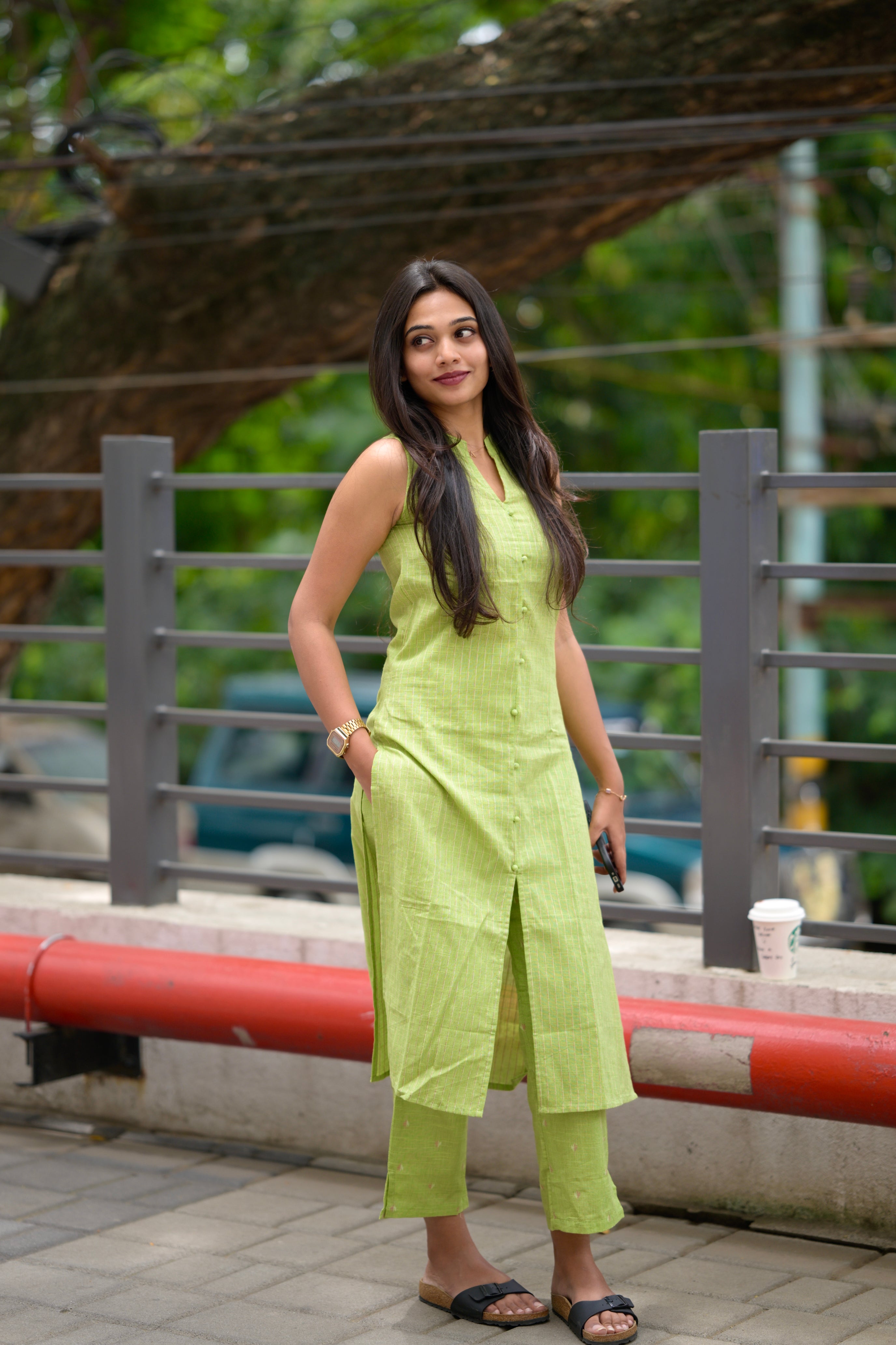 — Handloom cotton sleeveless kurta with smart collar neck detailing along with attached 11 inch sleeves inside the kurta along with matching trousers with functional pockets in apple green.