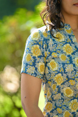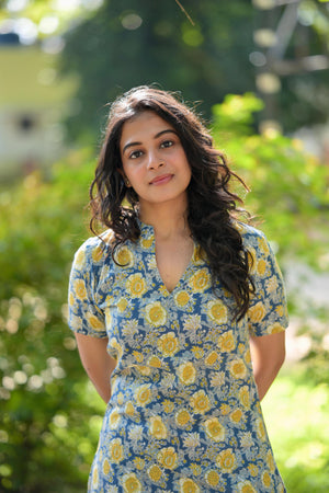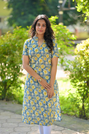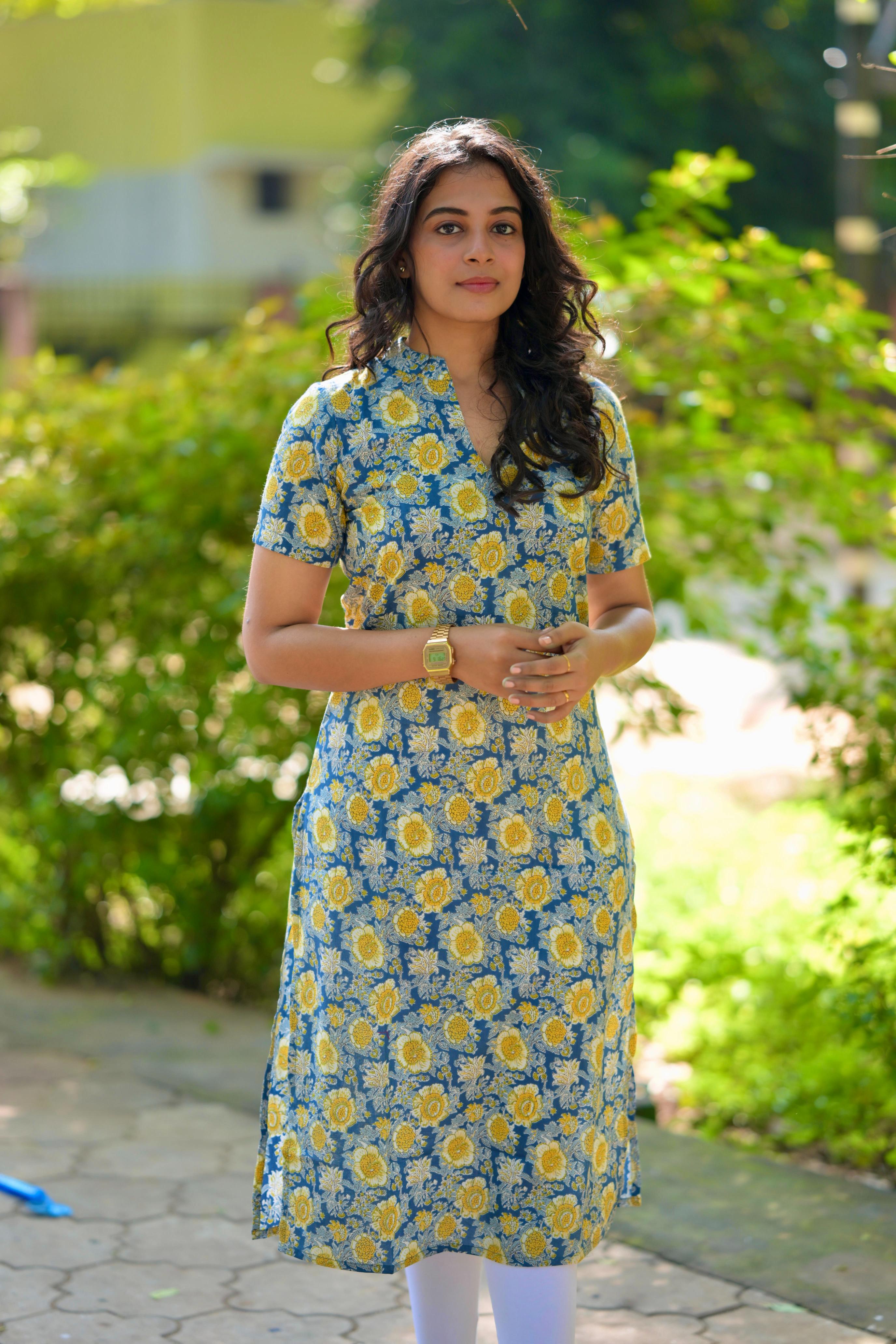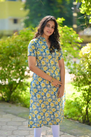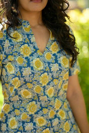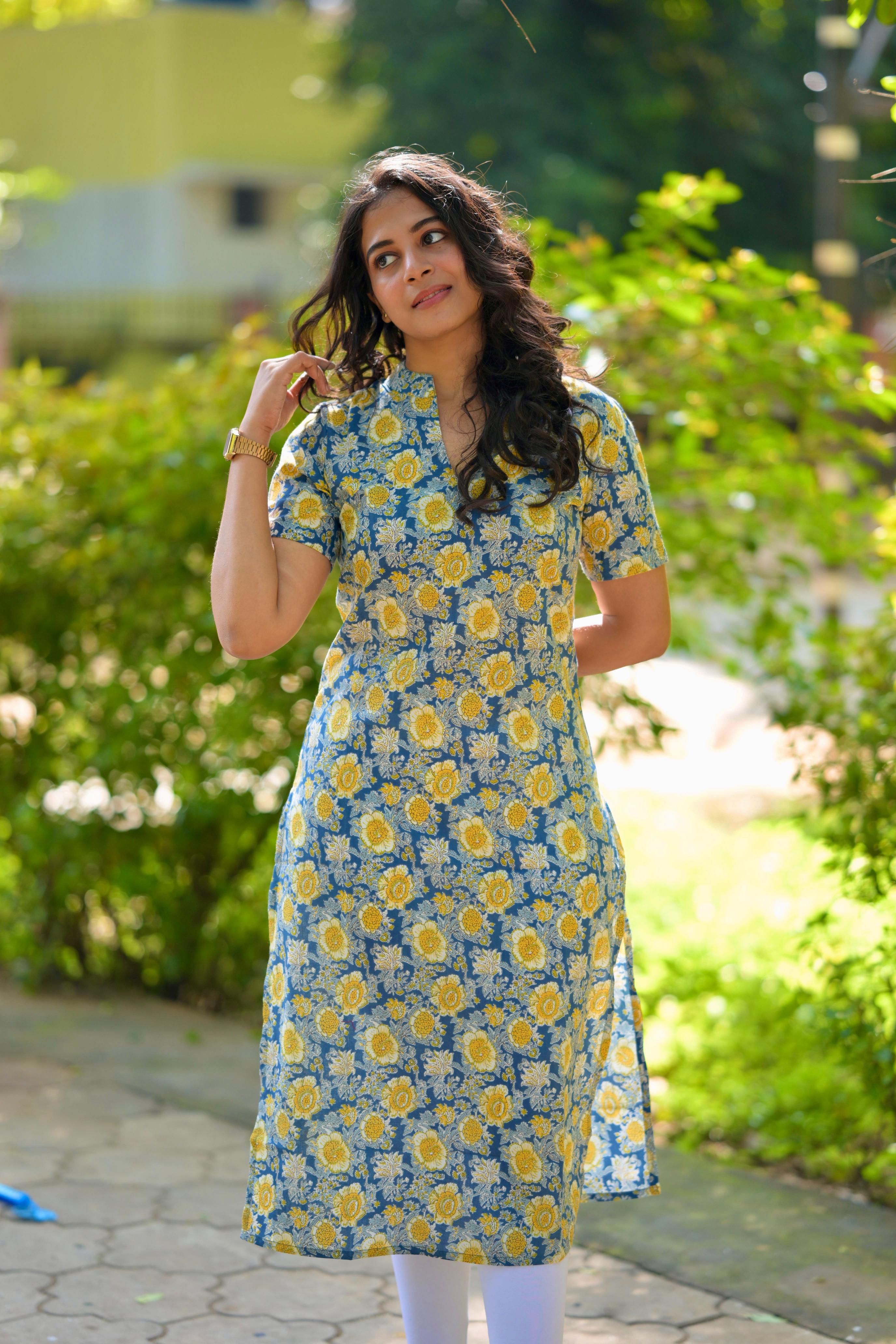 Kurti 100 - floral hand block printed cotton kurta in blue & yellow