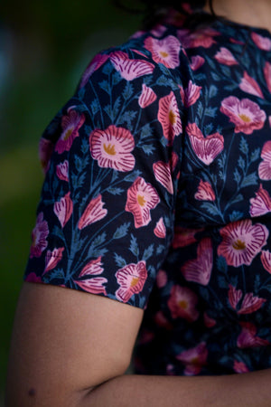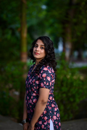 Kurti 105 - floral hand block printed cotton kurta in blue & pink