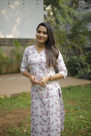 Kurti - 107 - Foral leaf printed cotton kurti in purple and white
