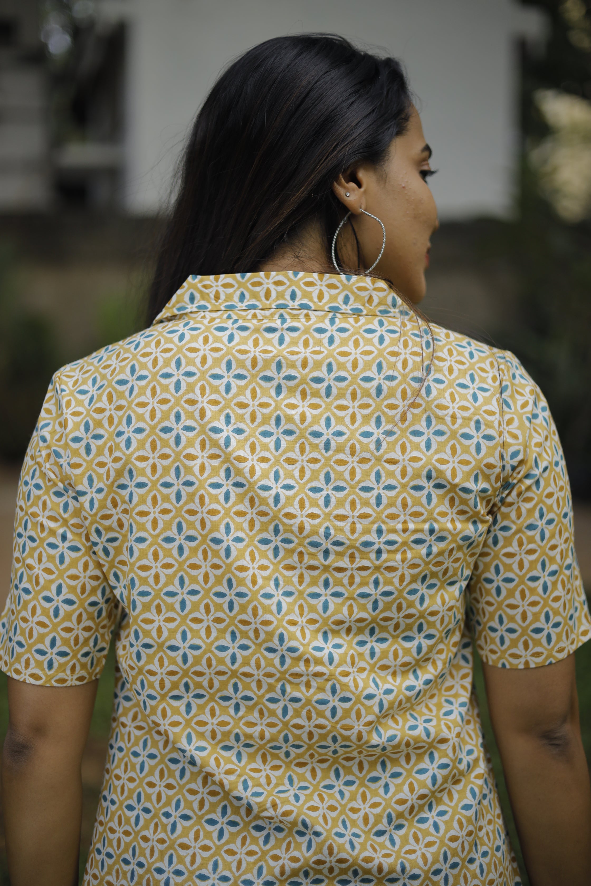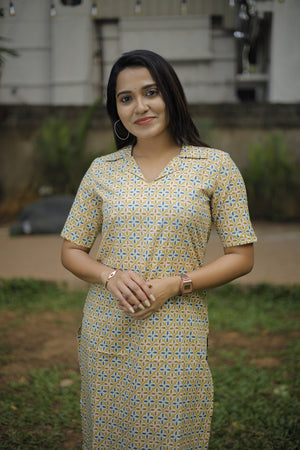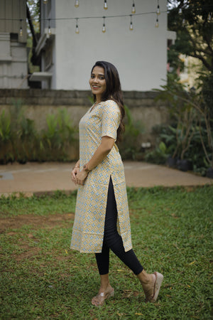 Kurti -122 floral motif printed cotton kurti in yellow and blue