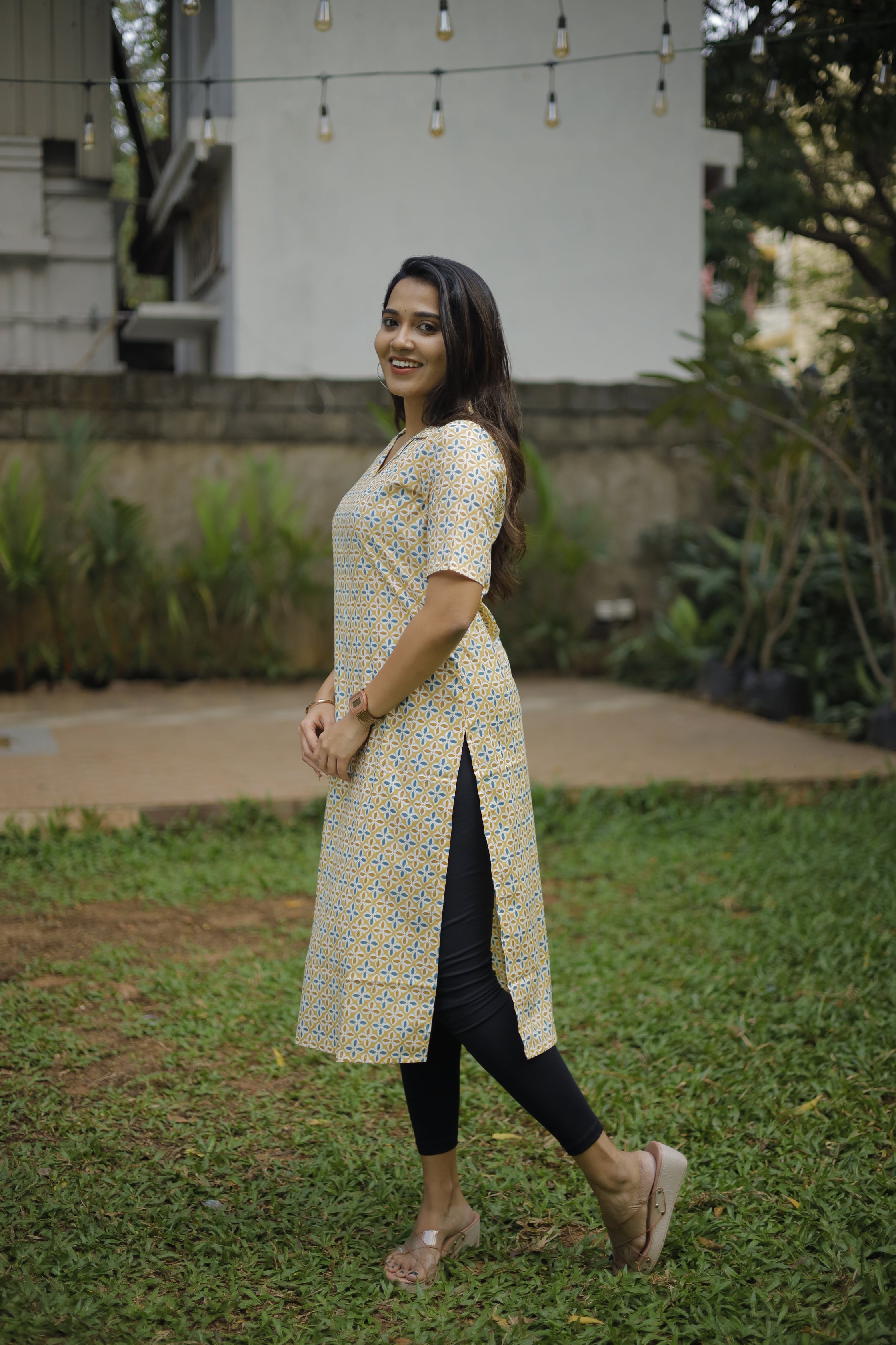 Comfy and super chic cotton kurti in classy and cute prints with smart neck and sleeve pattern. Perfect to pair it with jeans / leggings / trousers. Organic cotton is used making it the most apt for this summer.