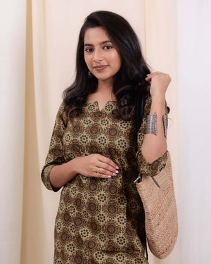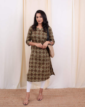 Kurti - 35 - hand block ajrakh dabu printed organic mul cotton kurta in brown and green