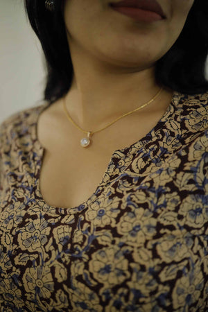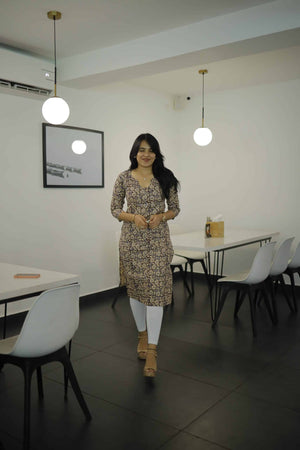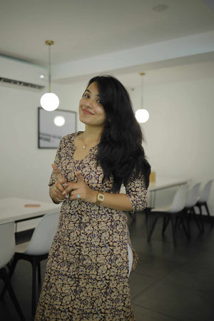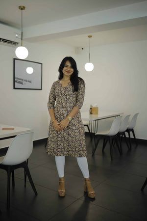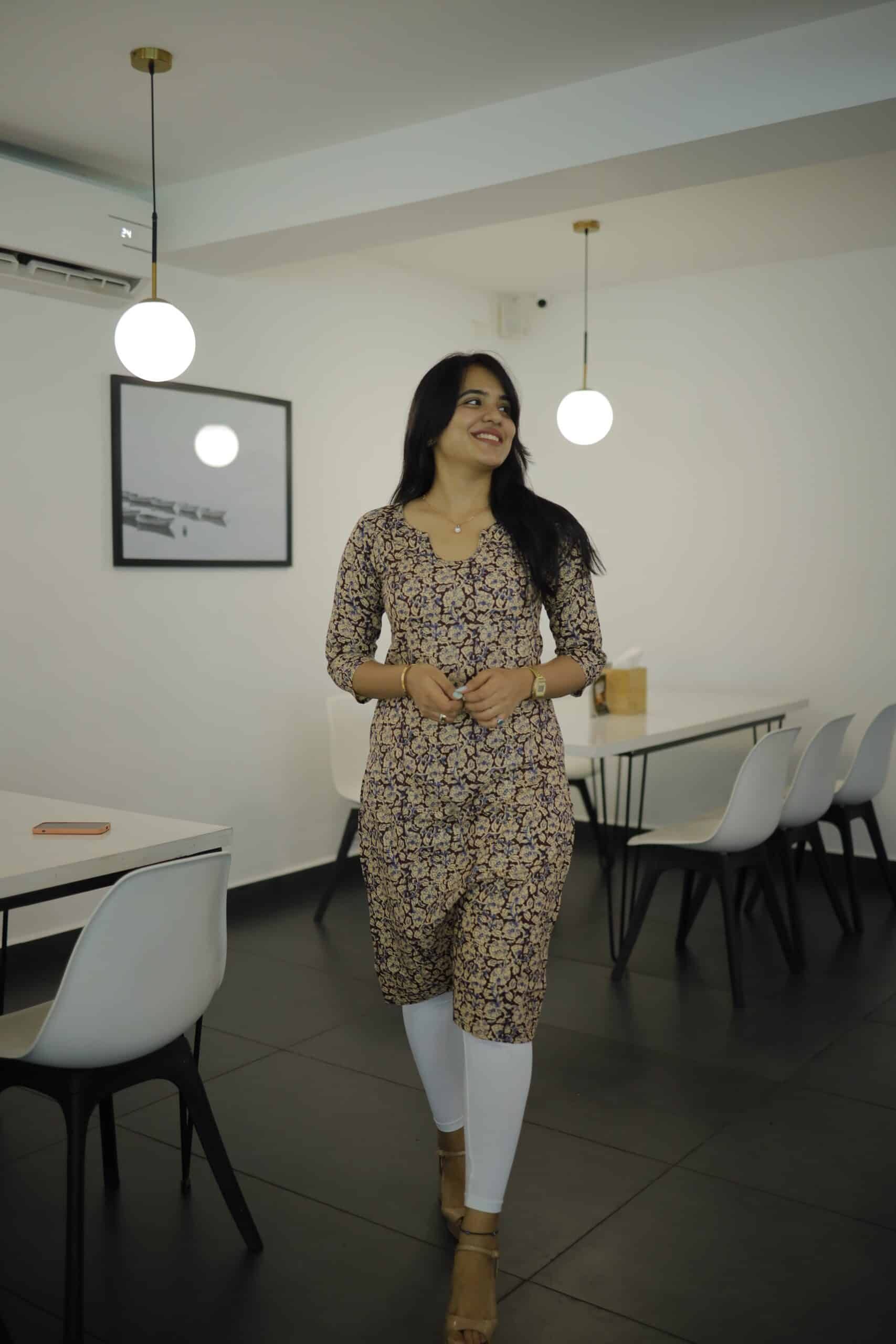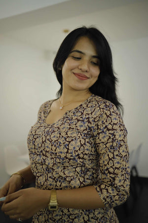 Kurti 51 - kalamkari floral hand block printed kurti in brown & blue