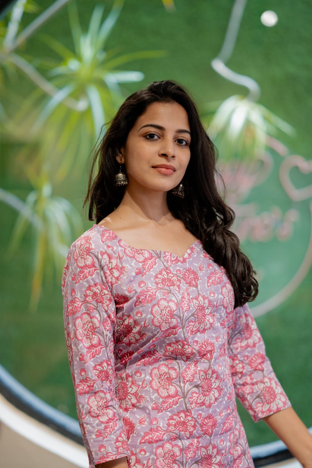 Kurti 80 - Jaal hand block printed cotton kurta in lavander and pink