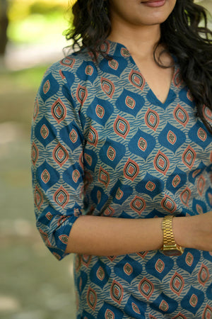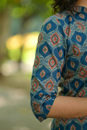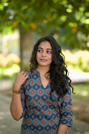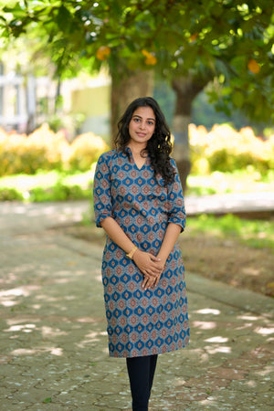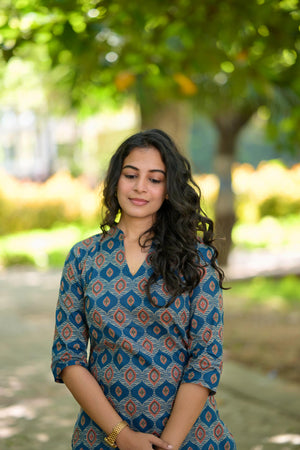Kurti 90 - ajrakh hand block printed cotton kurta in blue & rust red