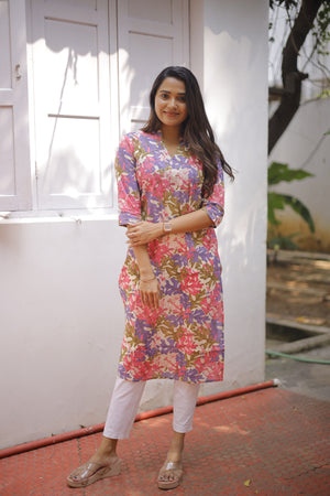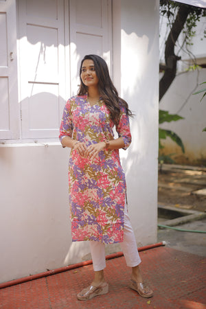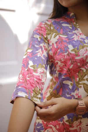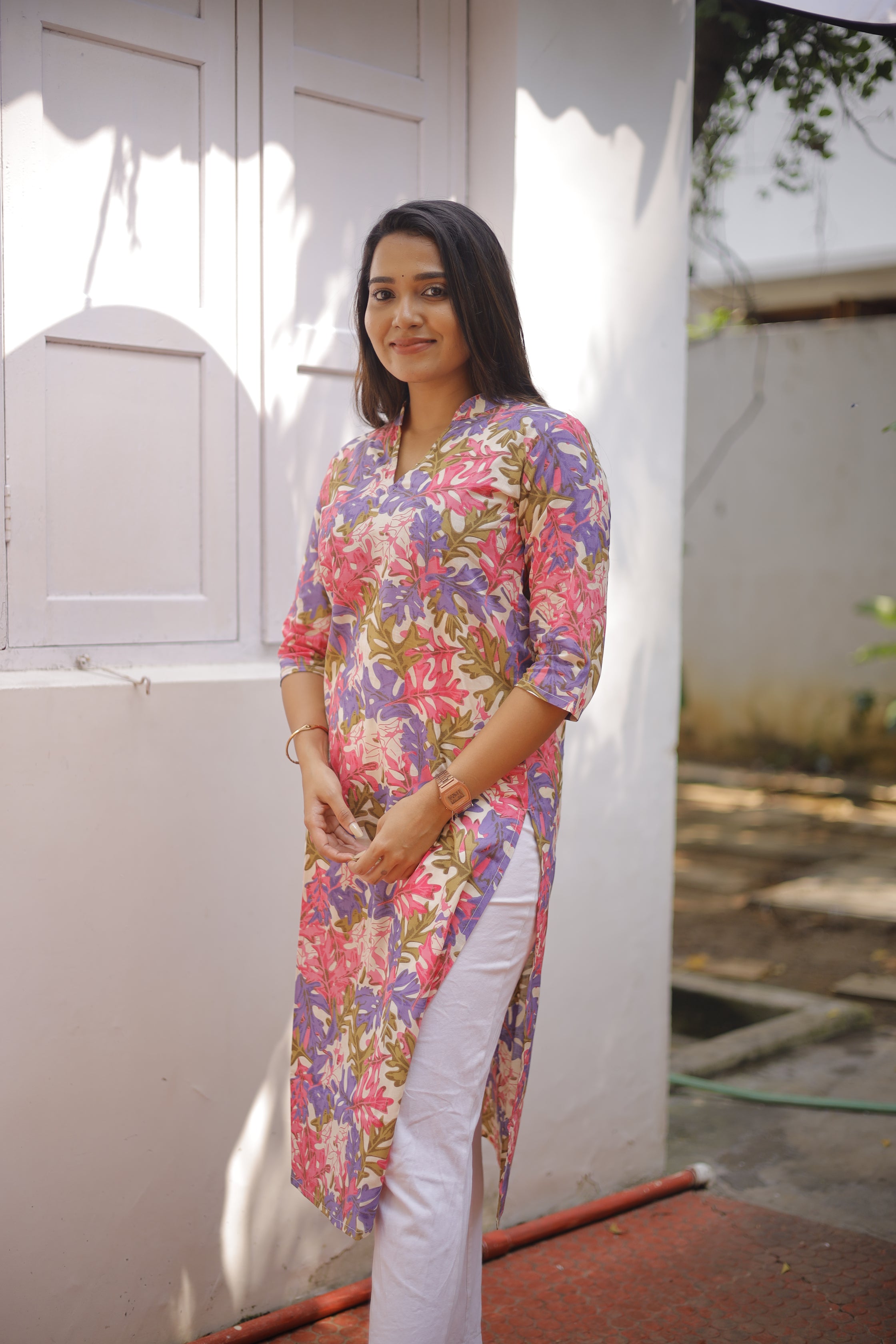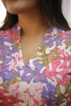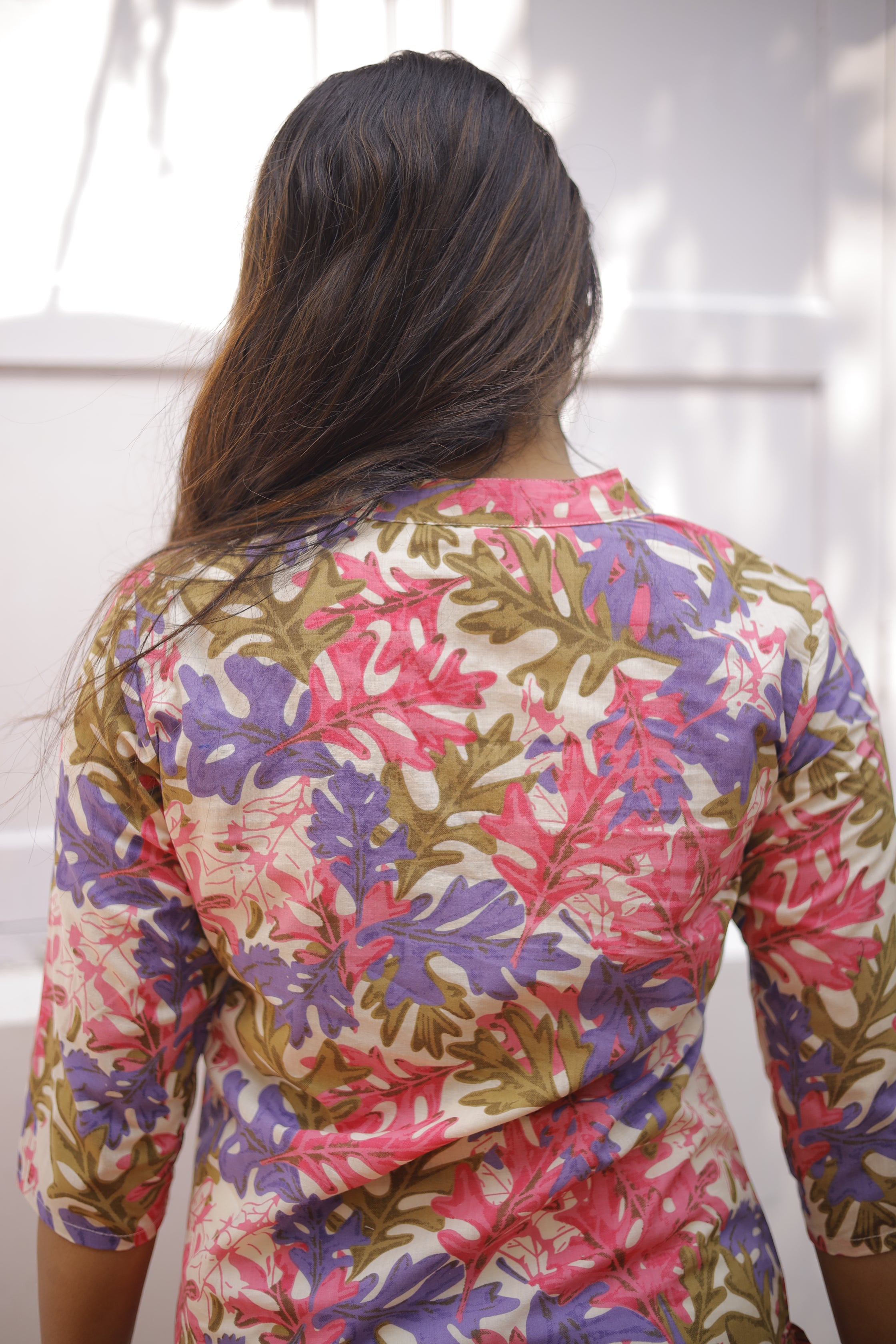 Kurti -117 - leaf printed cotton kurti in purple and pink