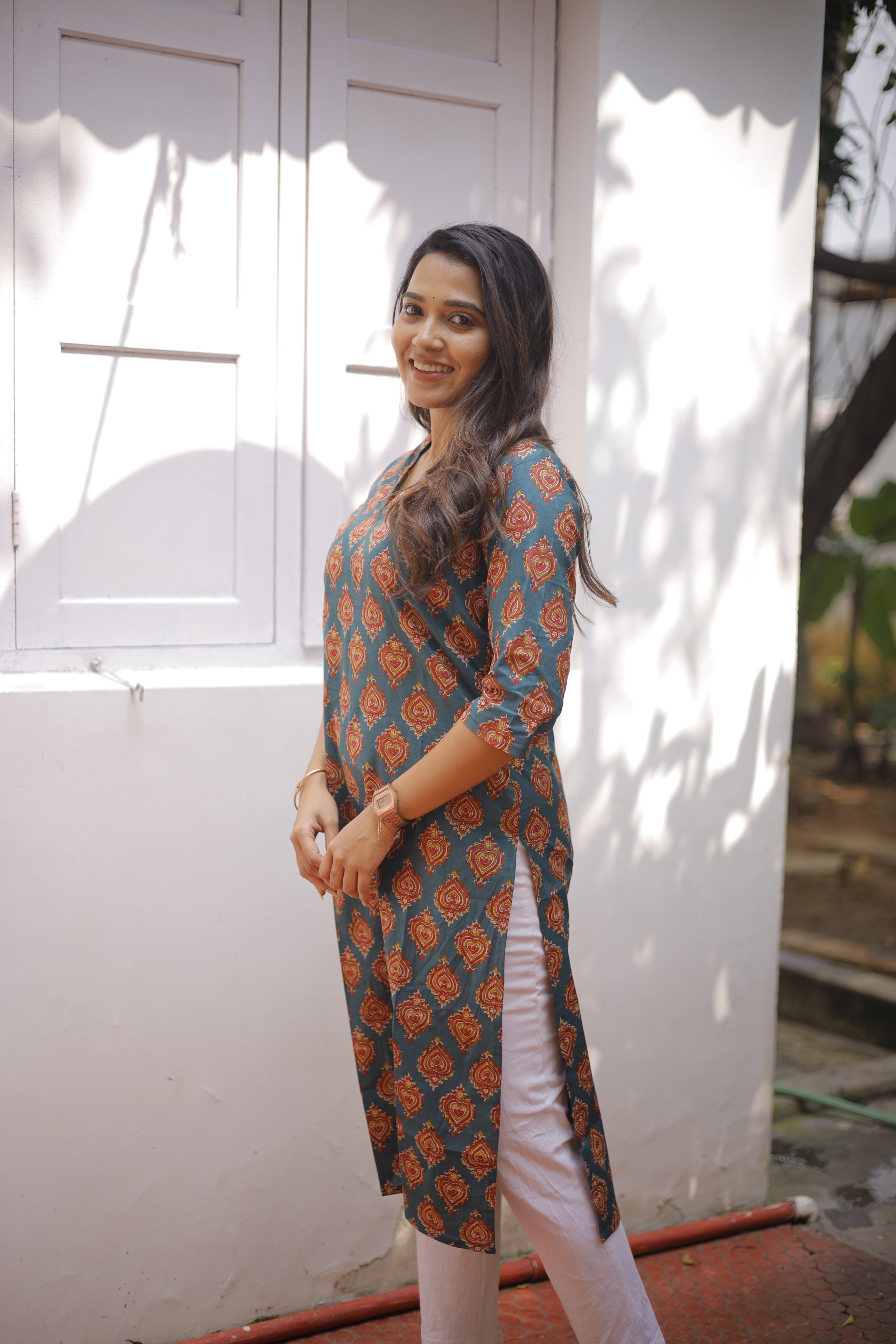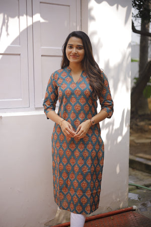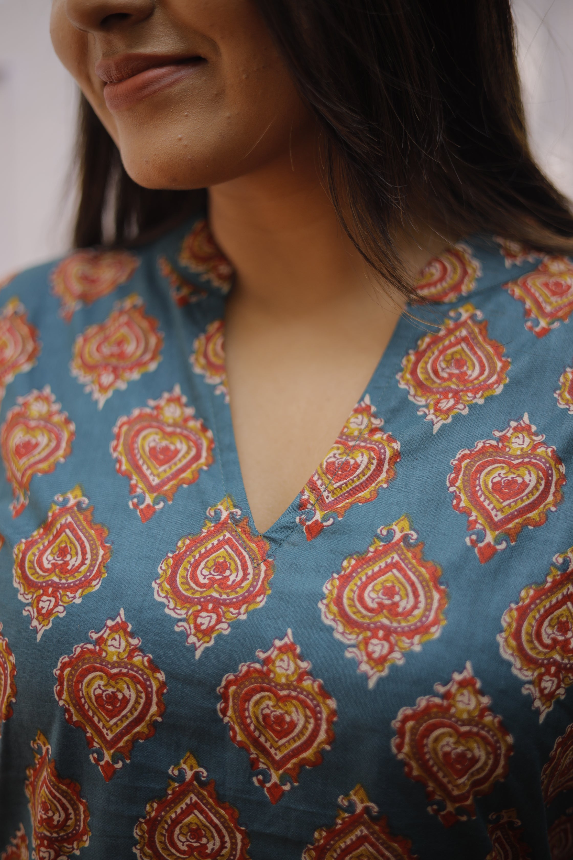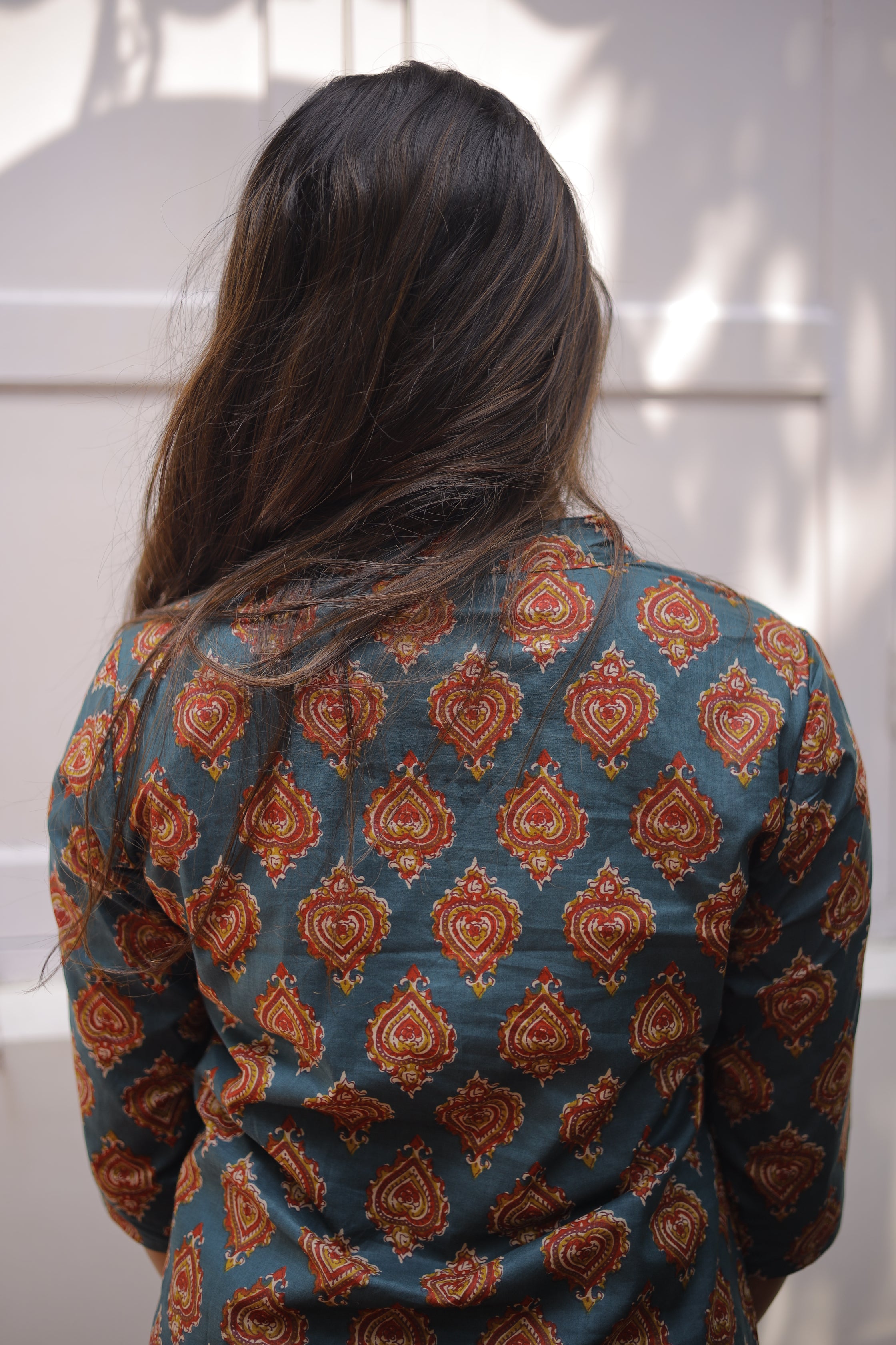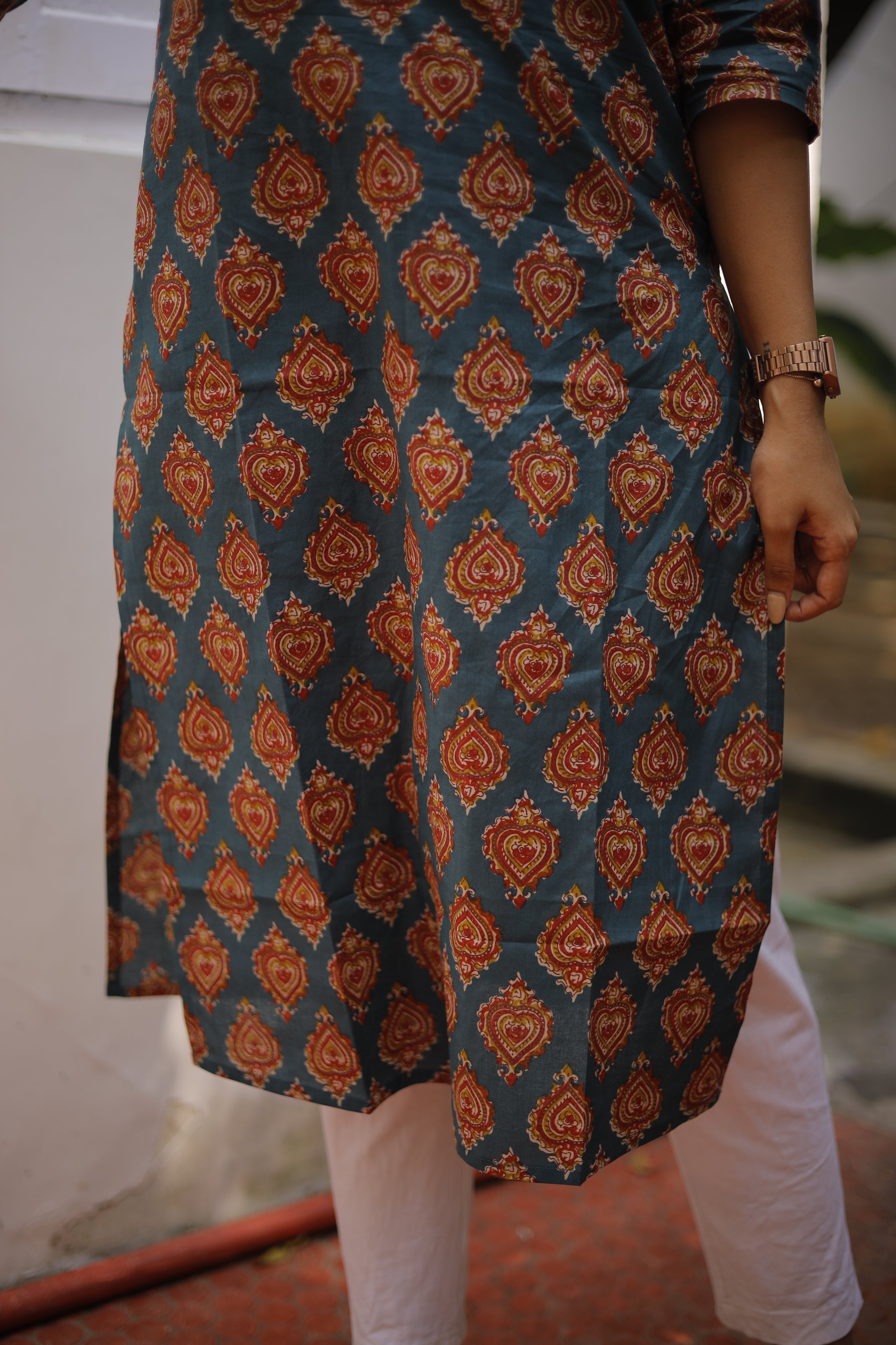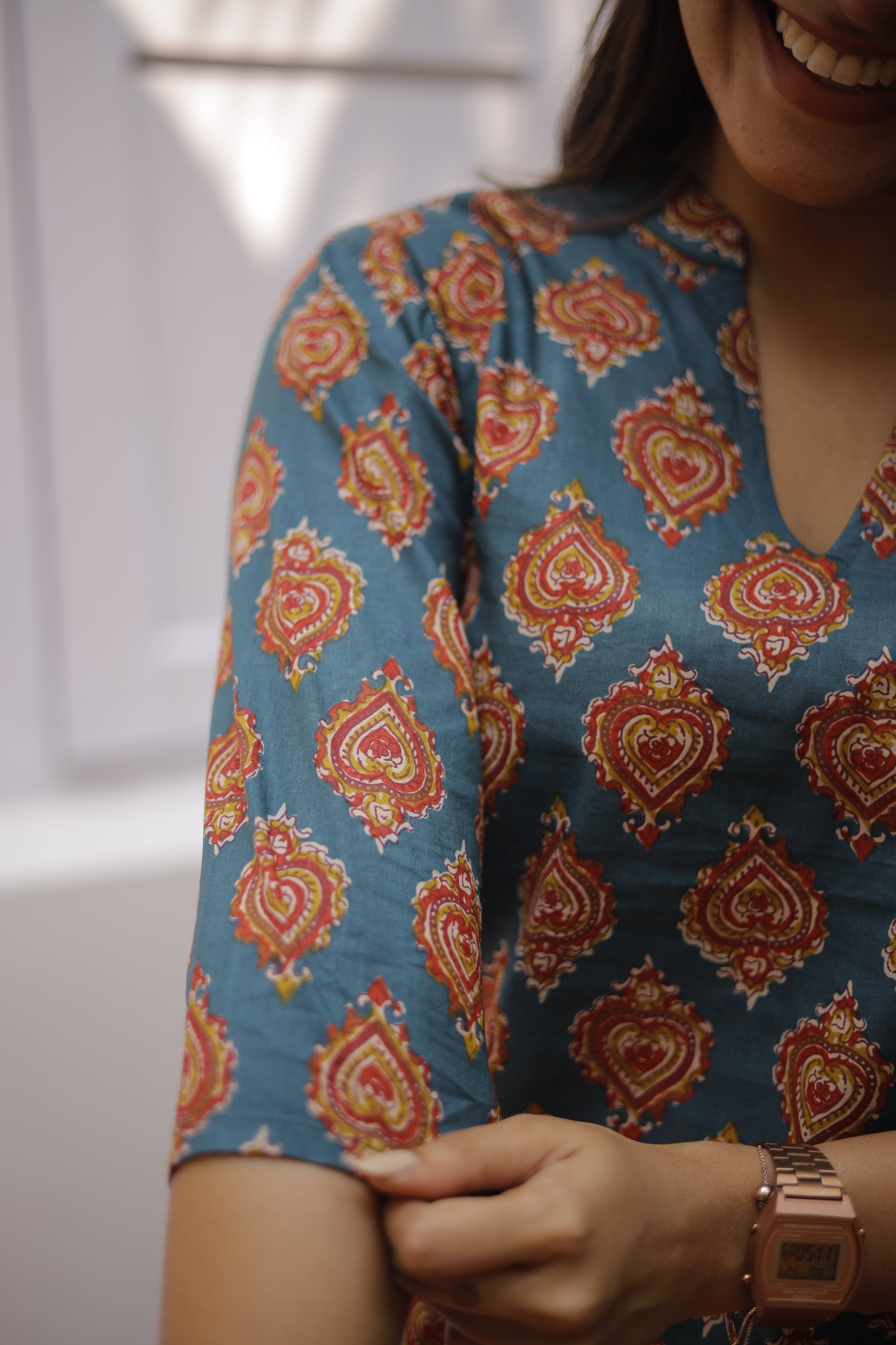 Kurti-114 - leaf motif printed cotton kurti in teal blue and red