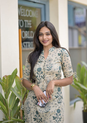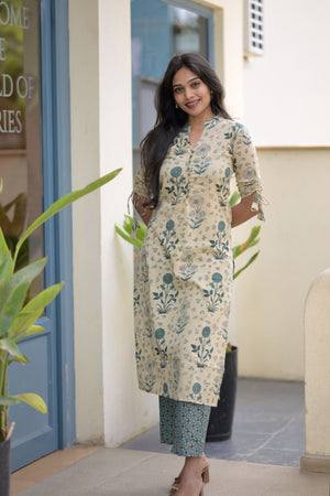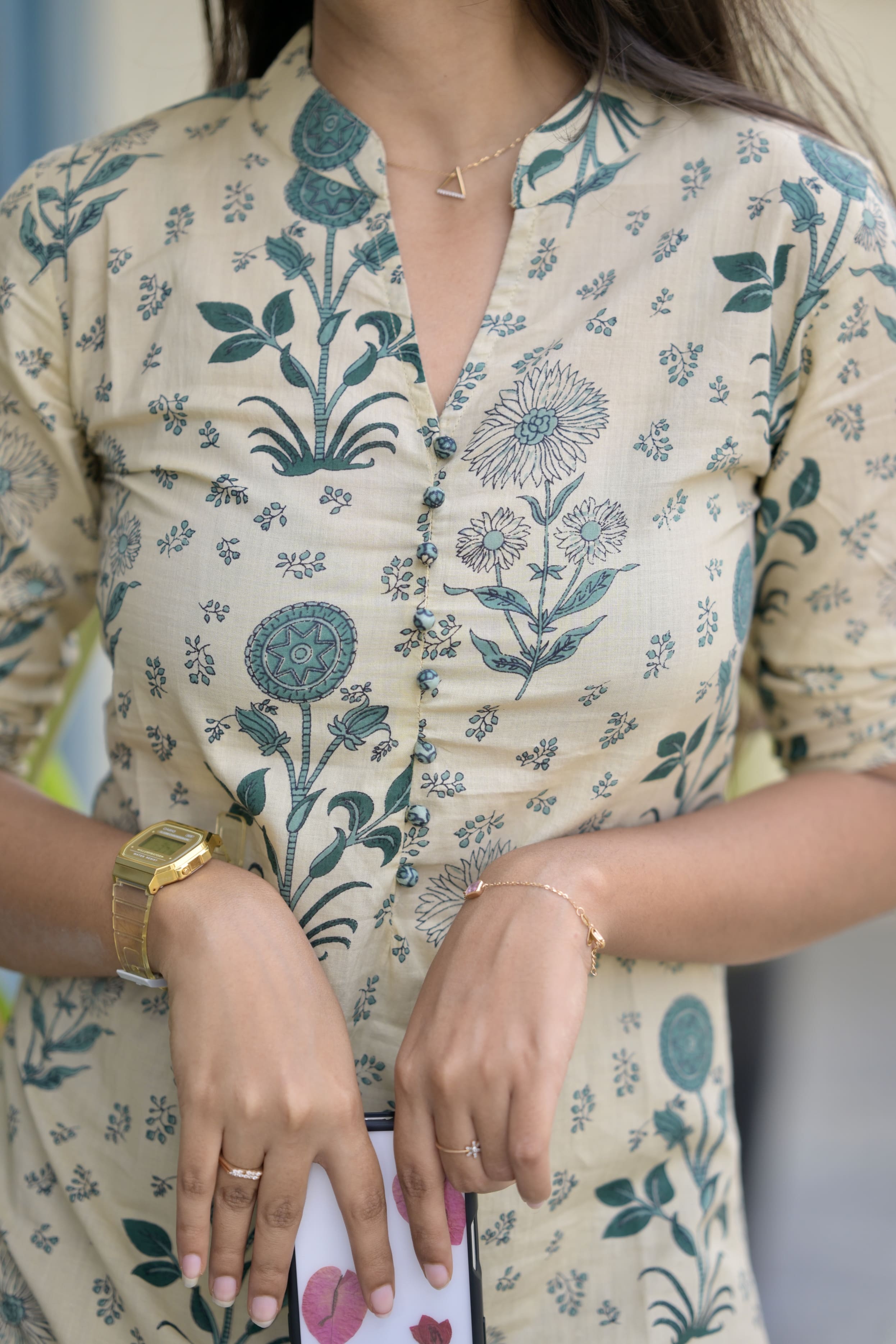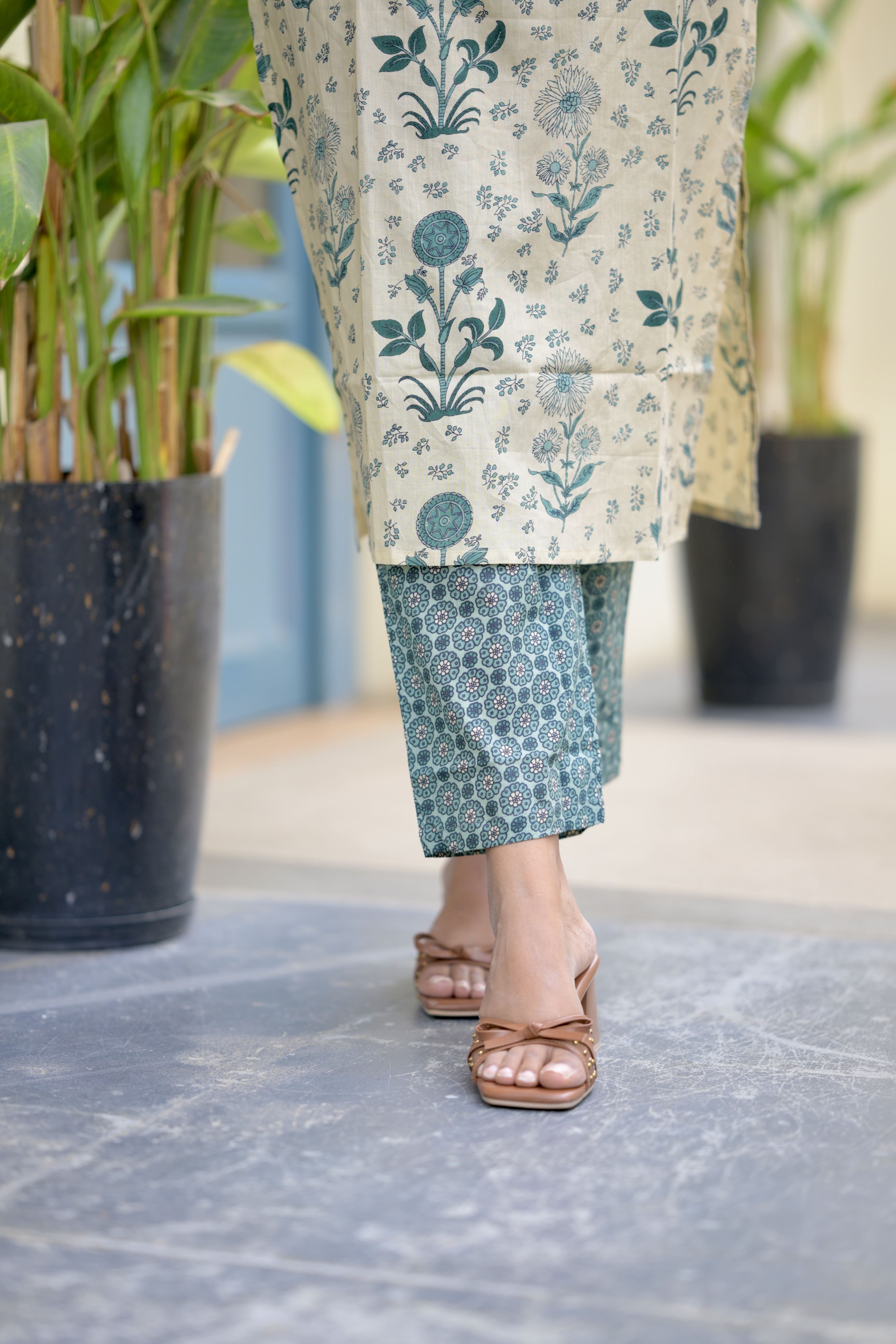 Kuyilini - floral hand block printed cotton kurta set in cream and teal green
