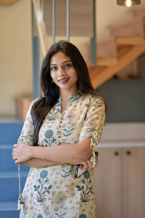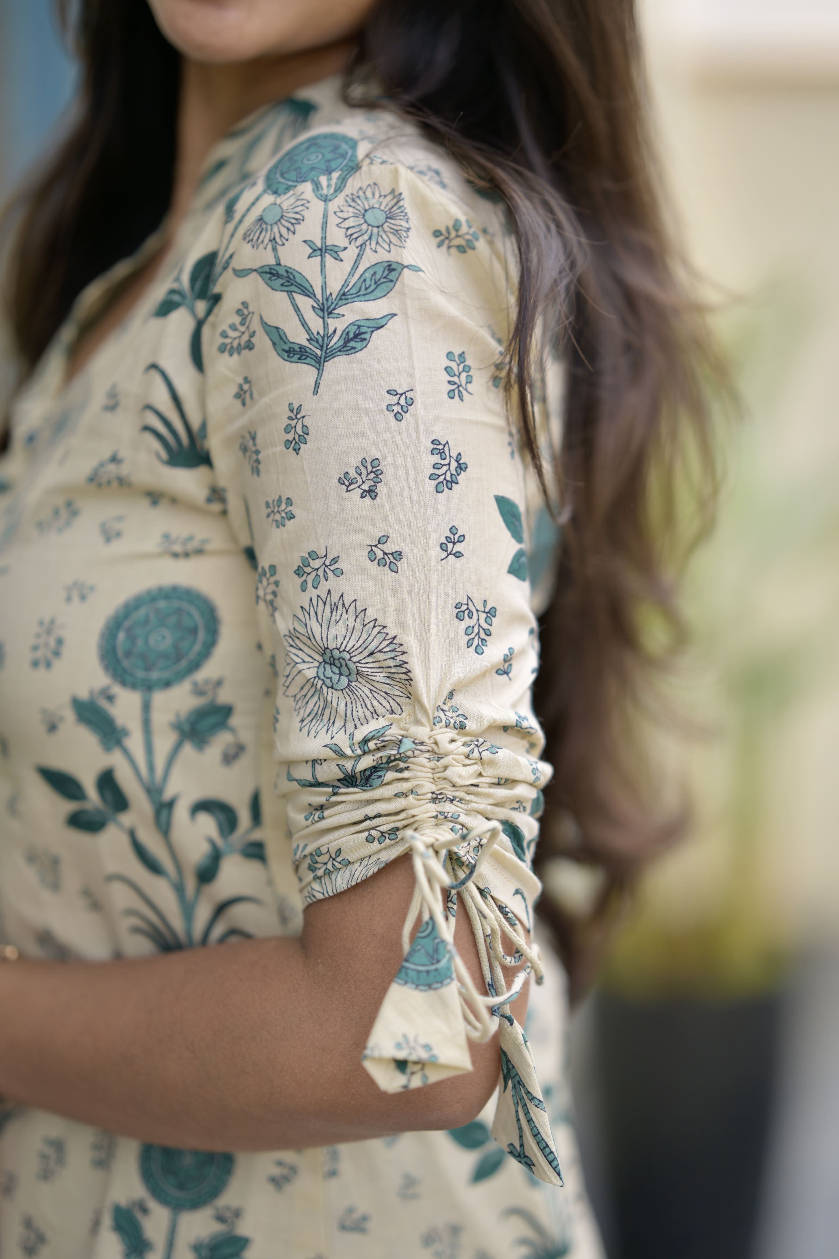 Floral hand block printed cotton kurta set with a smart collar neckline, gathered sleeves with knot detailing . Comes with matching trousers with functional pockets. Perfect for office / college