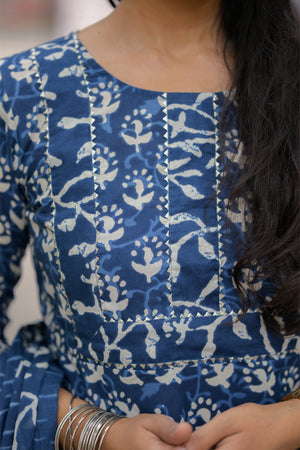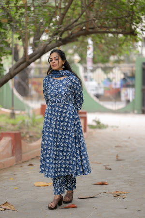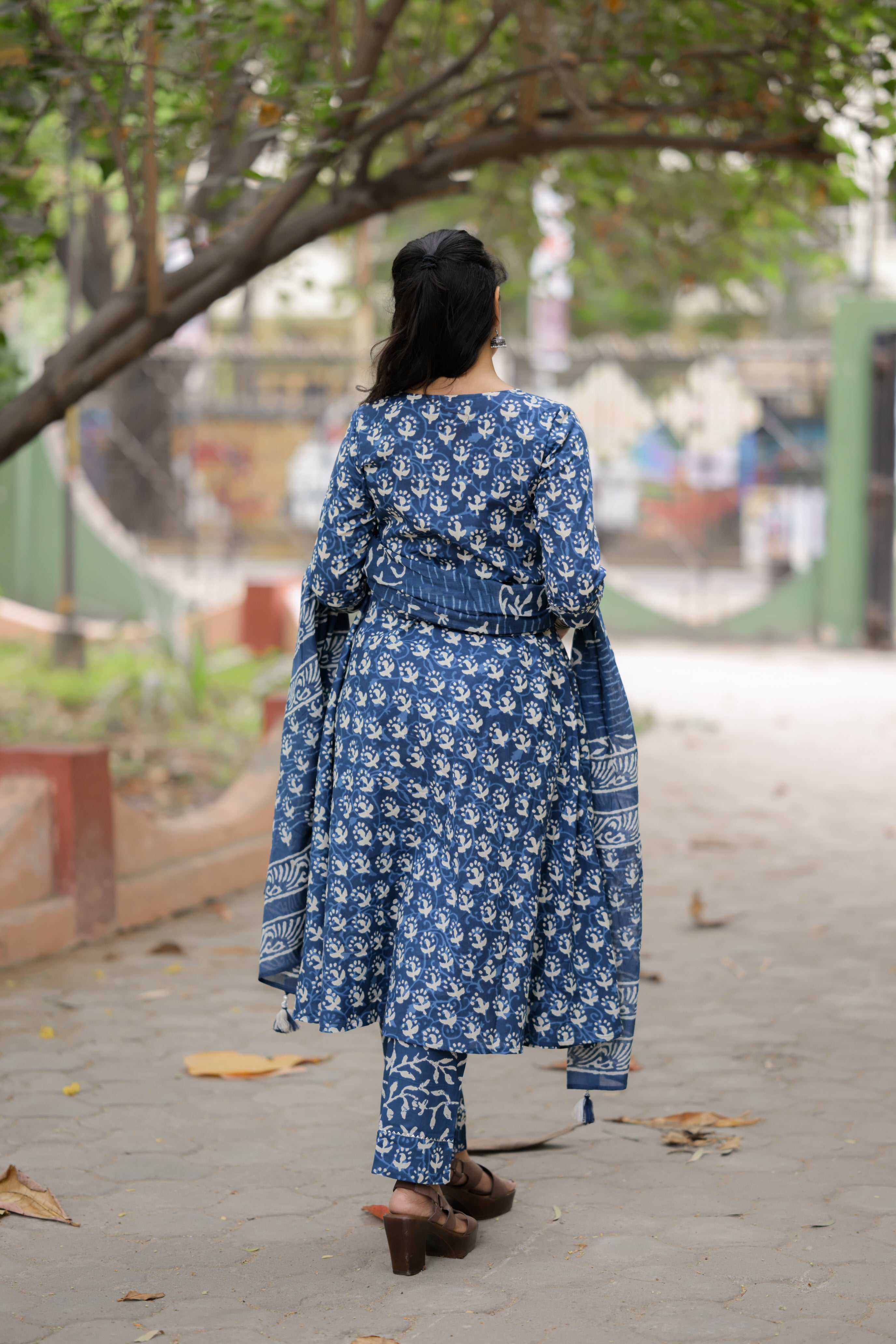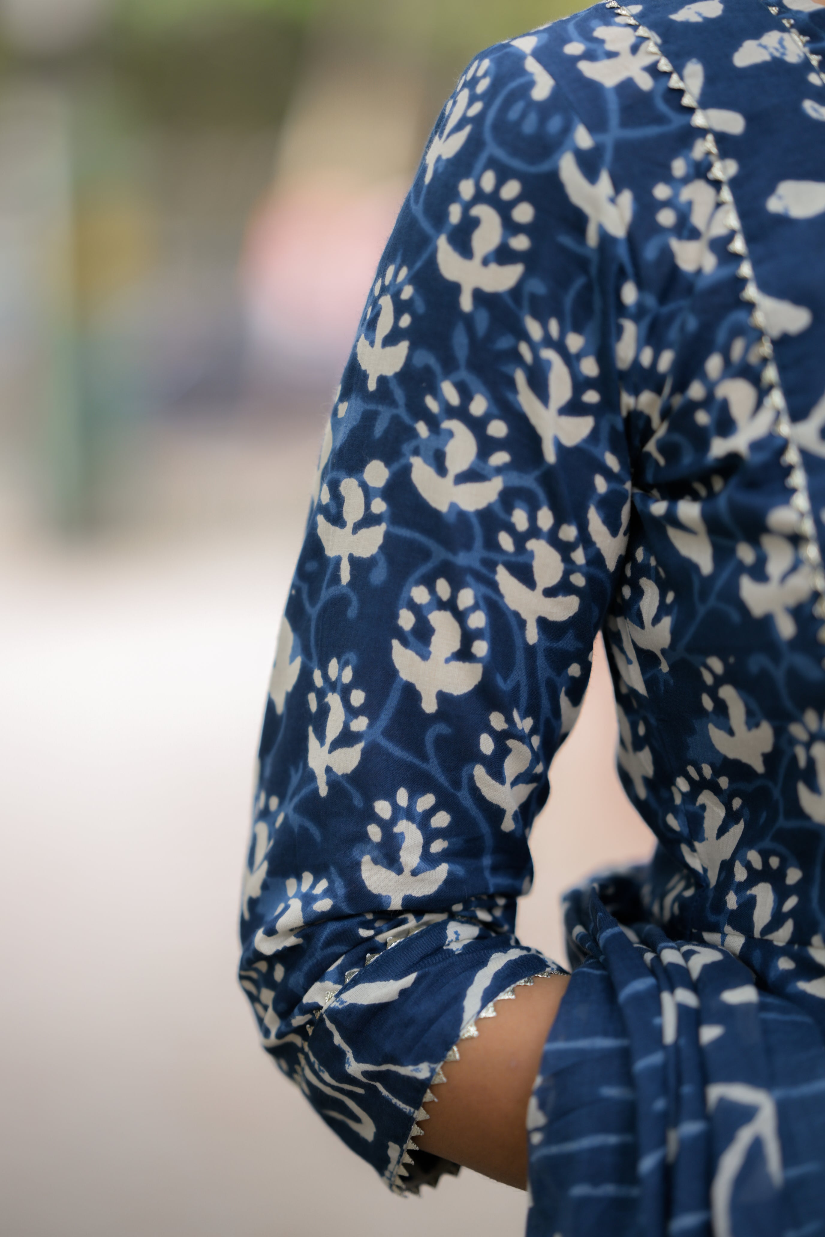 Indigo hand block printed cotton anarakali suit set with a smart neckline, 3/4th sleeves and matching hand block printed trousers with complimenting dupatta.