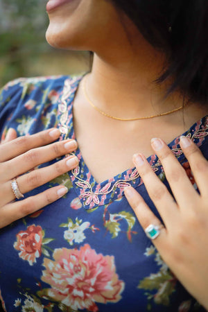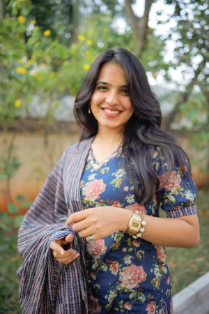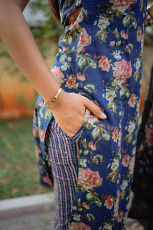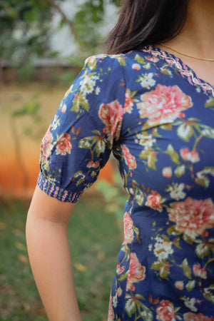 Dark blue organic cotton kurta with blush pink floral hand block prints all over. Beautiful hand embroidered work on the neckline and sequins work all over the kurta with highlights. Smart puffed dramatic sleeves adding to the grace of the look.