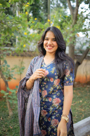 Laya 鈥� Floral Handblock Printed Organic Cotton Suit Set In Dark Blue