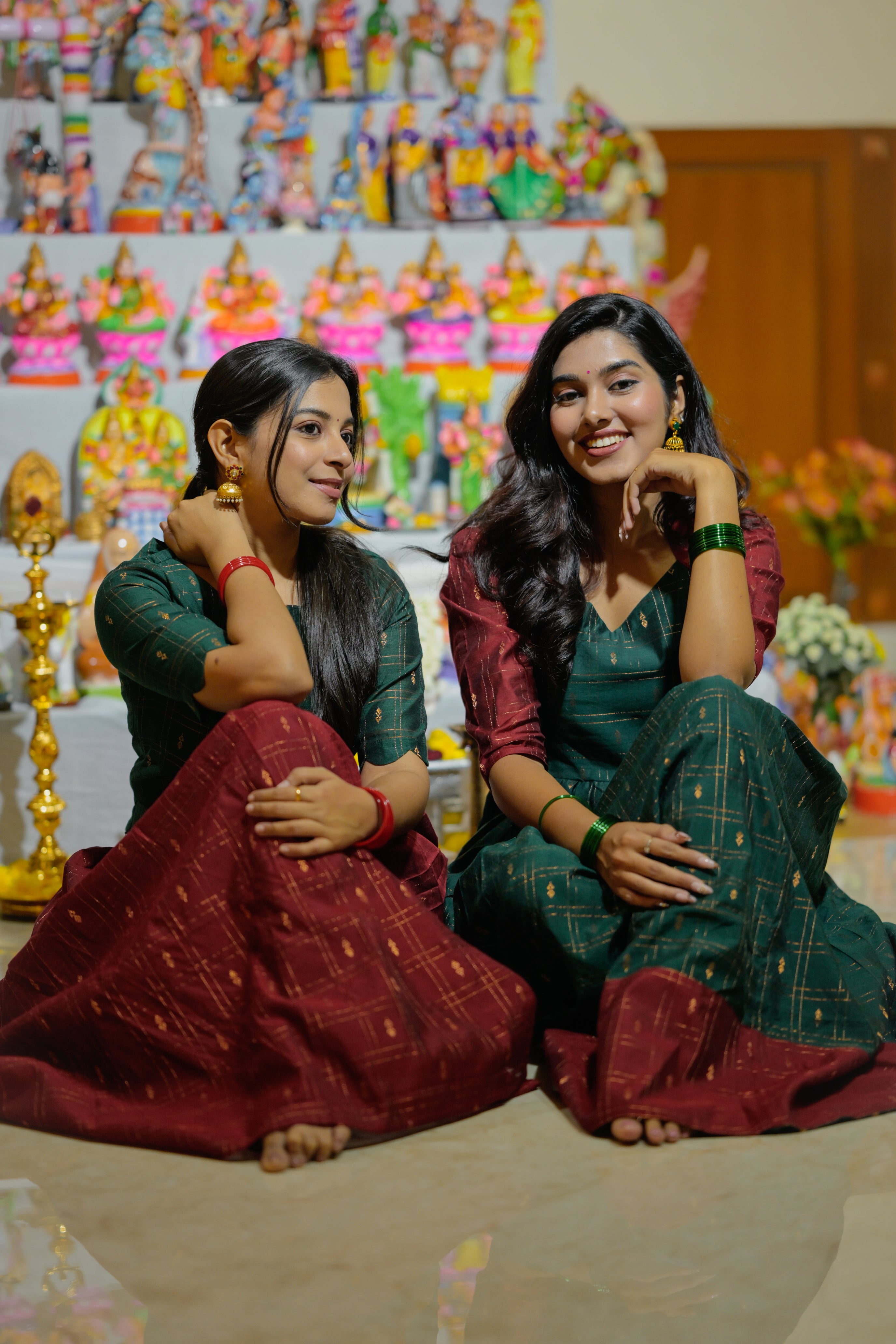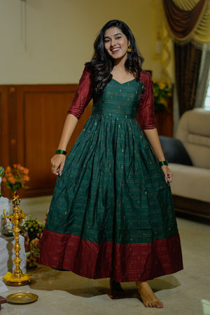 This 8 metre flared elegant floor-length gown is crafted in a rich emerald green fabric adorned with delicate golden thread motifs and subtle checked weaving, giving it a timeless ethnic charm. The gown features a contrasting deep maroon yoke, sleeves, and border, creating a striking two-tone effect that enhances its festive appeal. The fitted bodice with a flattering neckline flows into a voluminous skirt, blending comfort with sophistication. Paired with simple bangles and traditional earrings, this gown radiates effortless beauty — perfect for festive occasions, family celebrations, and cultural gatherings.