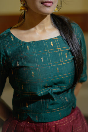 This traditional ensemble pairs a deep green handwoven blouse with a rich maroon skirt, both crafted in subtle checked and woven motifs that add texture without overwhelming the look. The blouse, with its simple square neckline and elbow-length sleeves, strikes a perfect balance between elegance and comfort. The flowing maroon skirt comes with functional pockets and it brings a graceful contrast, its earthy tone enhancing the richness of the outfit. Gold jhumkas and the soft hairstyle complete the attire, making it ideal for festive occasions, family gatherings, or traditional functions.