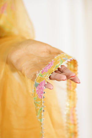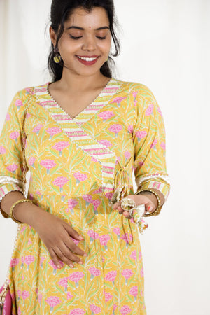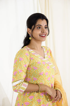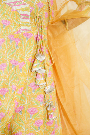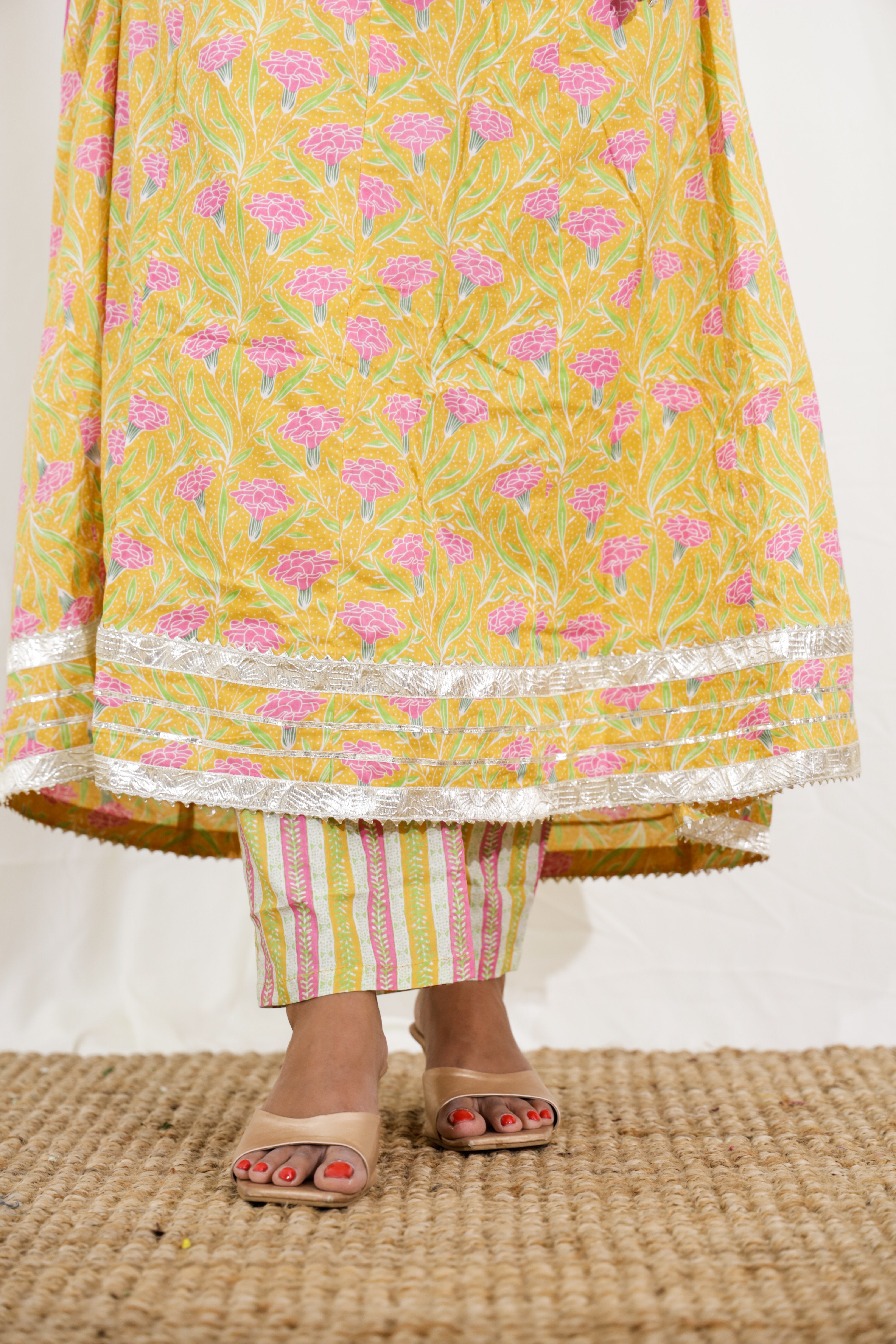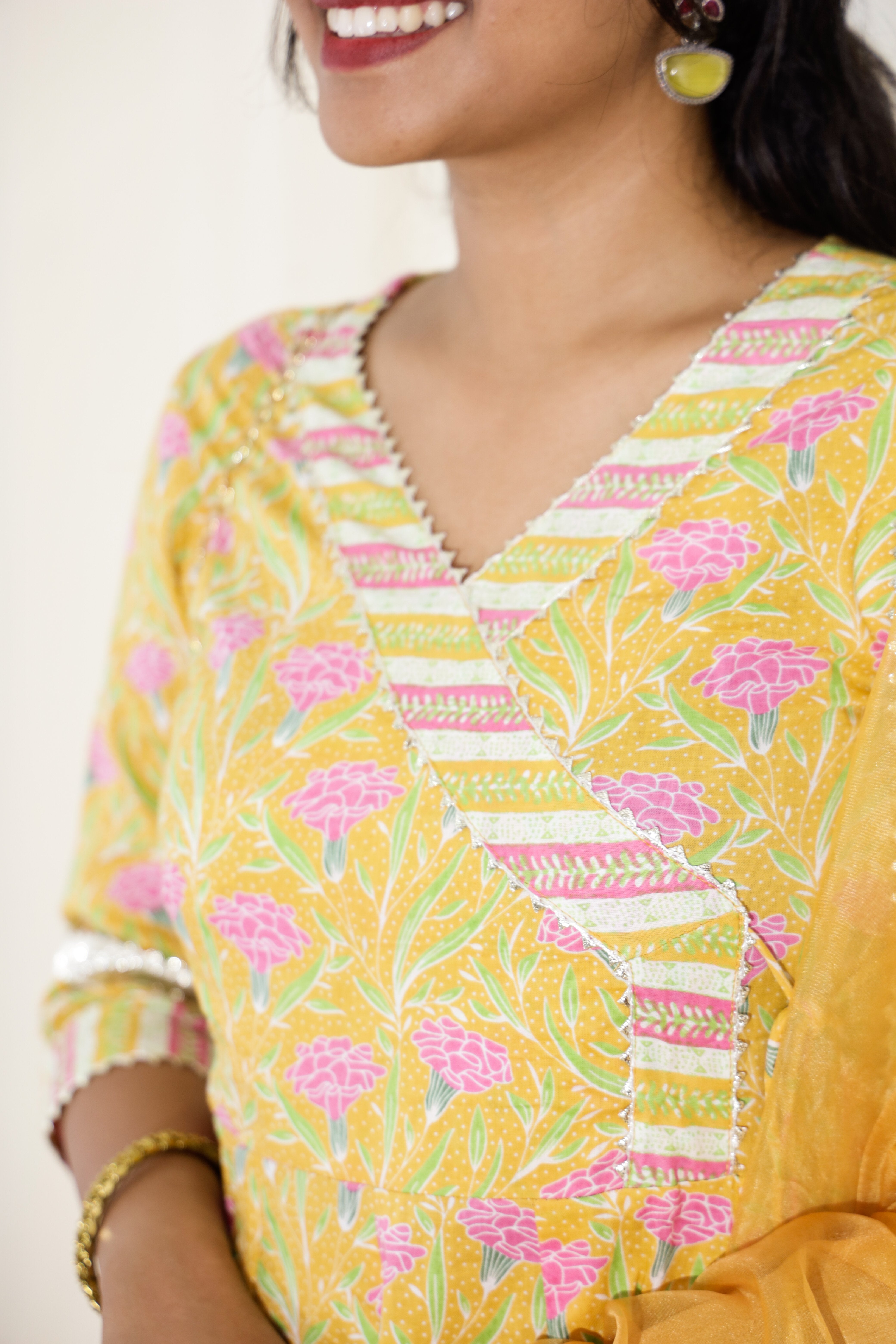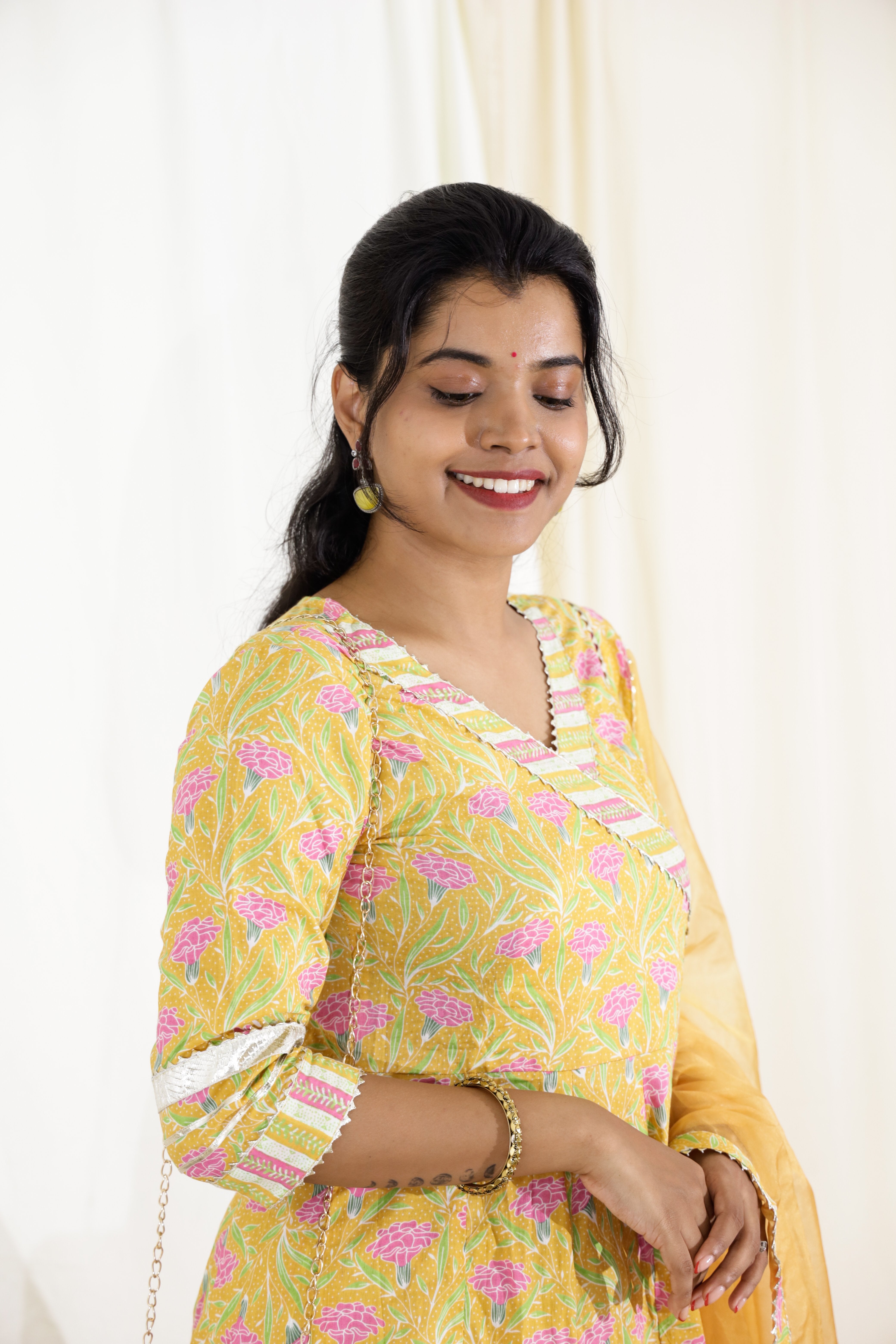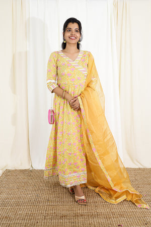 "Crafted from luxurious organic cotton this hand block printed fit and flare anarkali suit set exudes elegance and charm perfect for occasions. The unique colour palette of this kurta set, the most beautiful neck details and the sleeves, the intricacy of the hand work involved and beautiful gota patti and pretty laces just makes it a must have for this festive season. Comes with a beautiful and a breathtaking dupatta which has a bling with hand worked laces all over the dupatta.