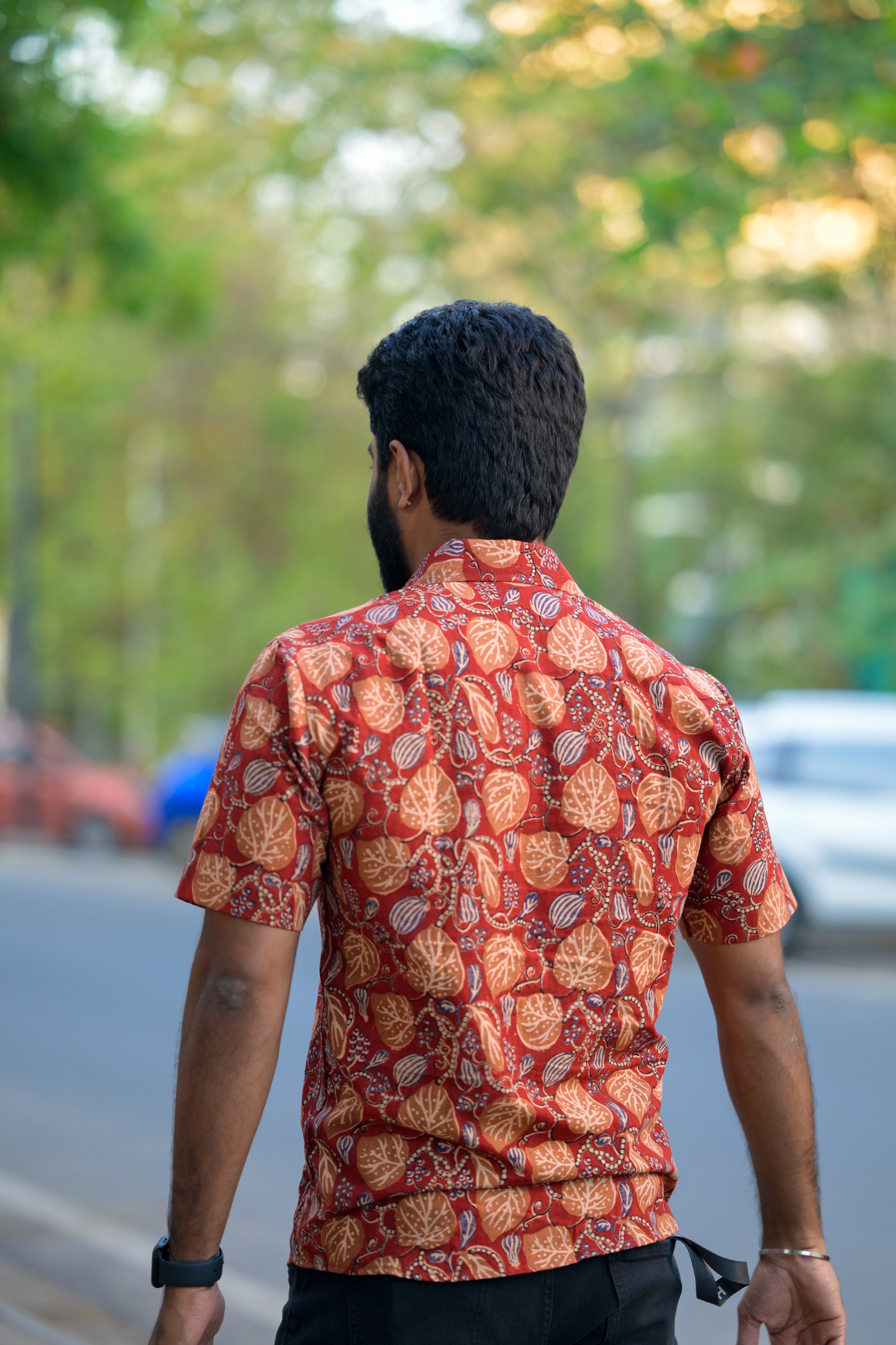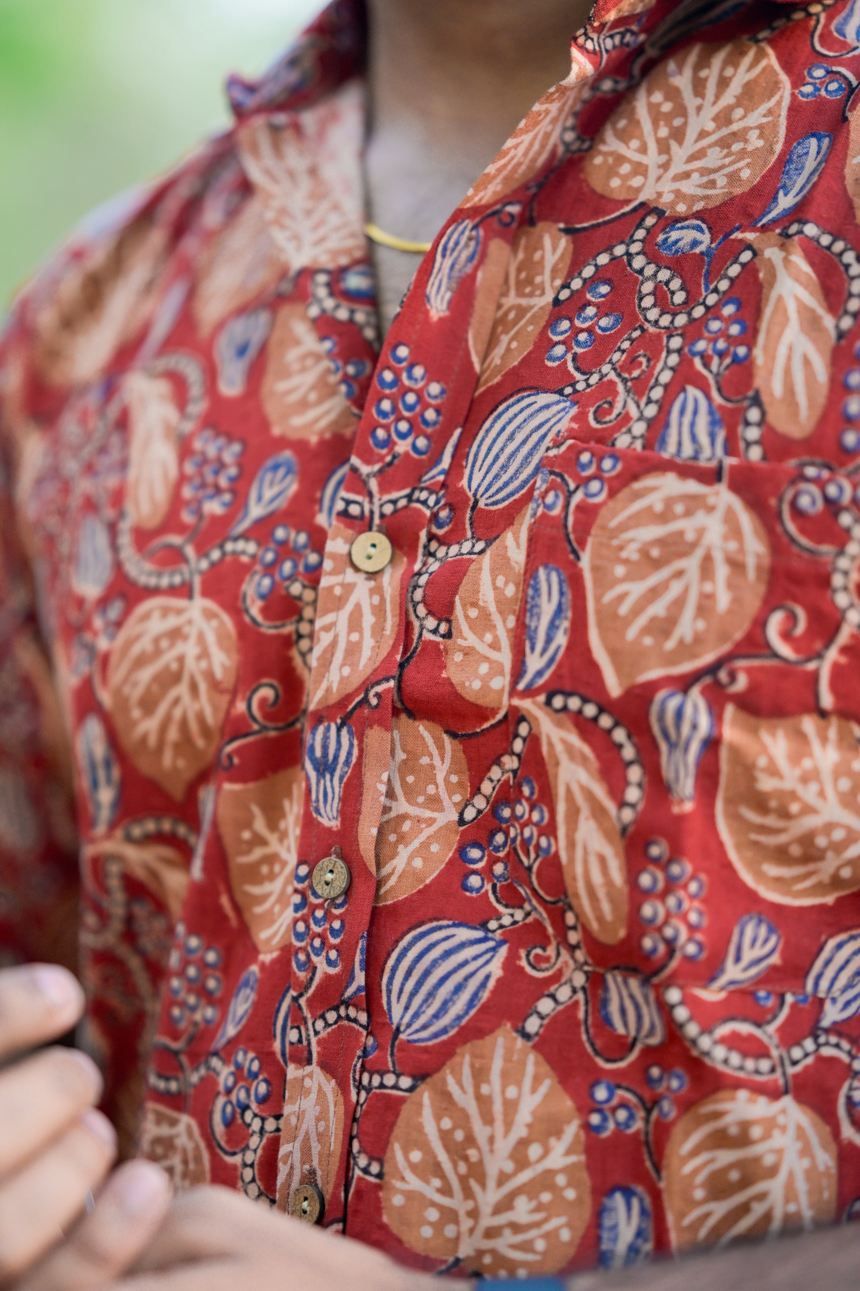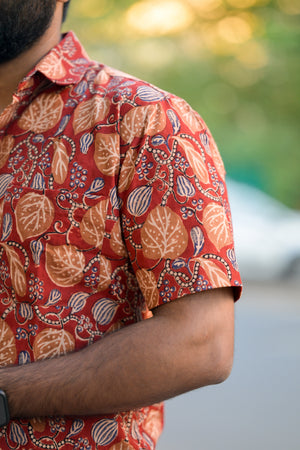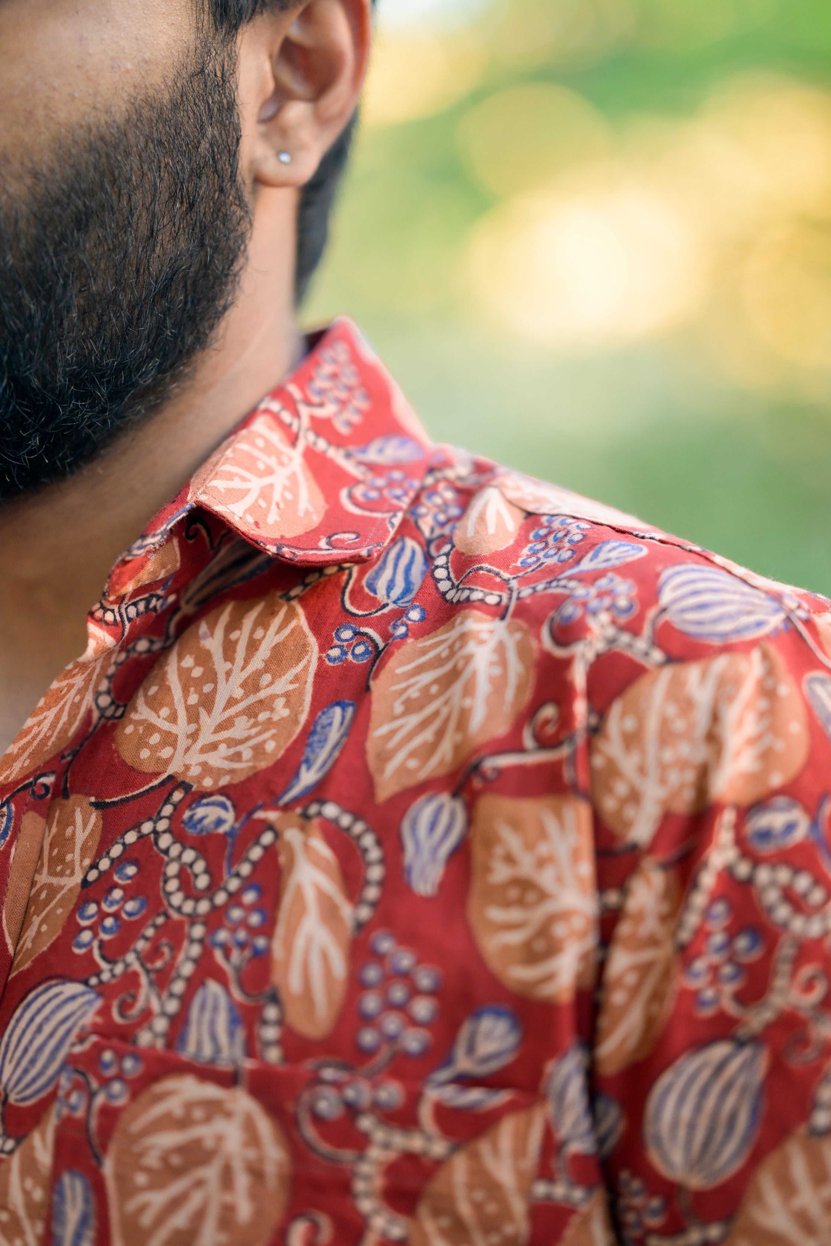 Shirt -31 - Leaf handblock printed organic cotton shirt in red and orange