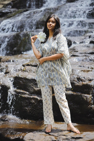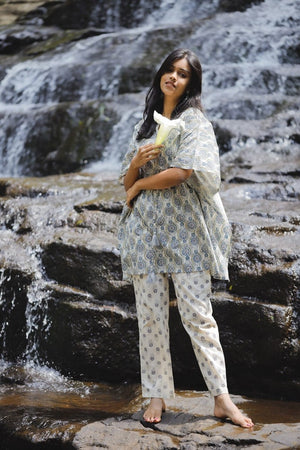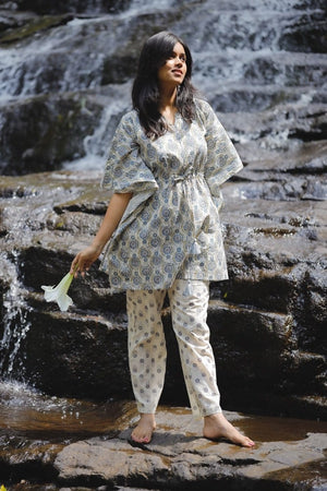 Mirza kaftan set - hand block mandal silhouette printed kaftan kurta in off white and blue