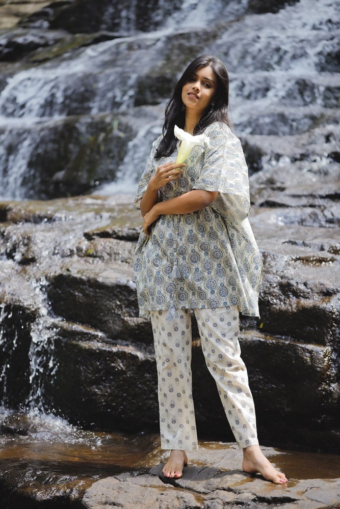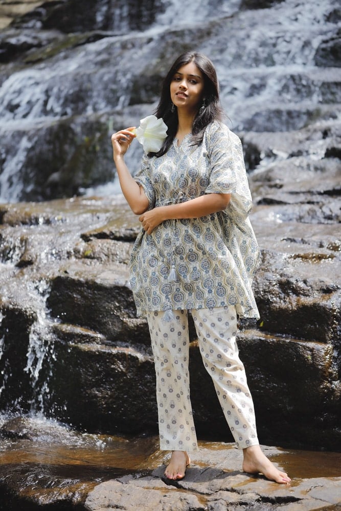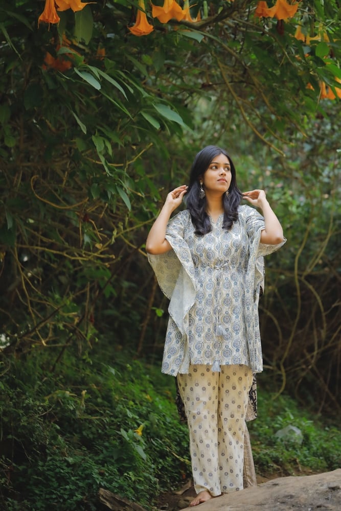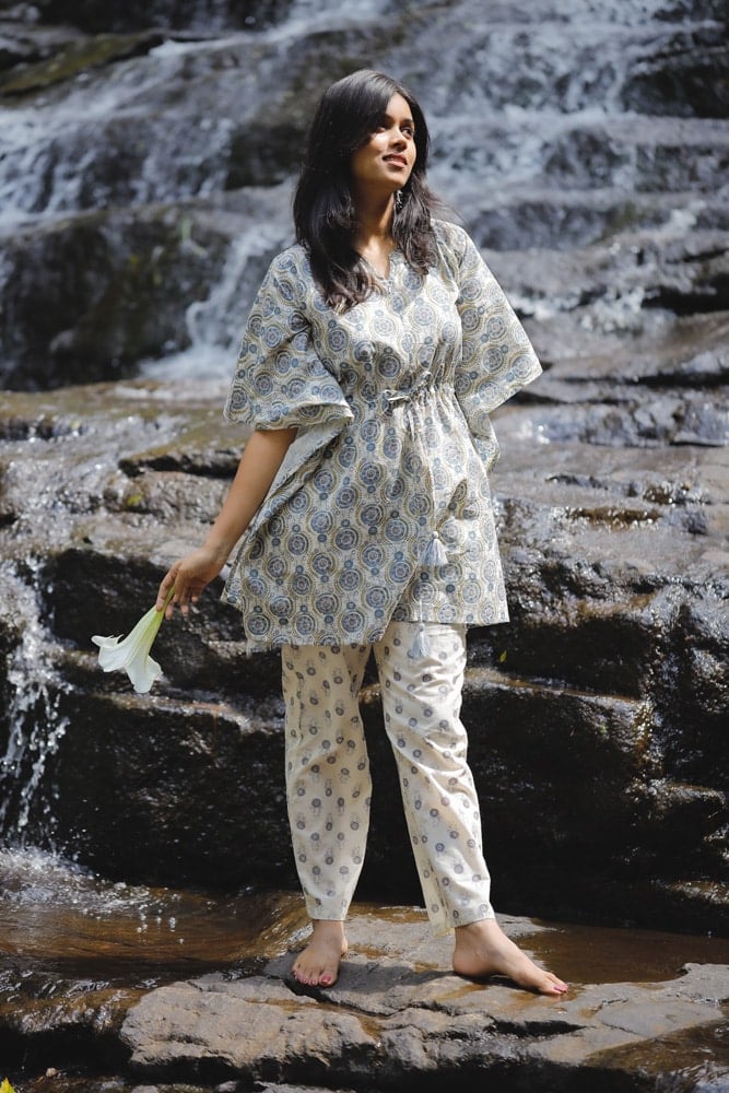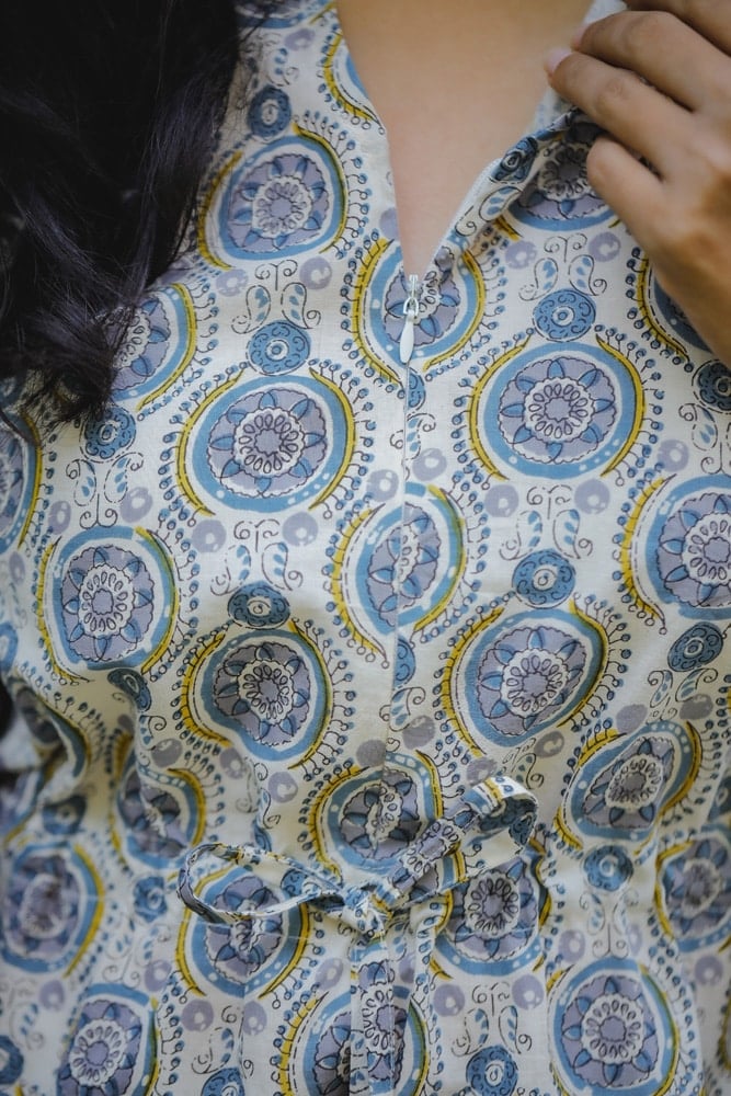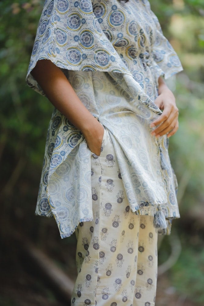 A beautiful mandal silhouette hand block printed kaftan kurta in off white and blue in pure organic cotton fabric with pretty and cute tassels along with concealed zips ( an addn feature to aid nursing moms too )