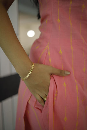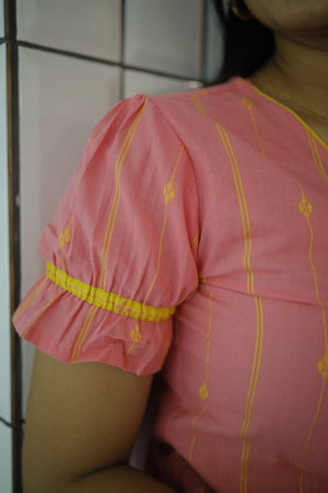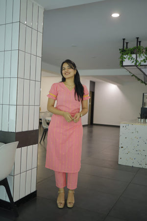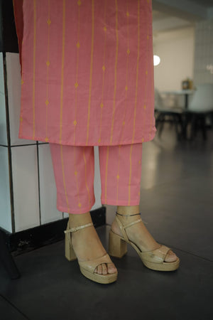 Nairiti coord set - Handwoven lines and buttas in handloom cotton kurta set in pink and yellow