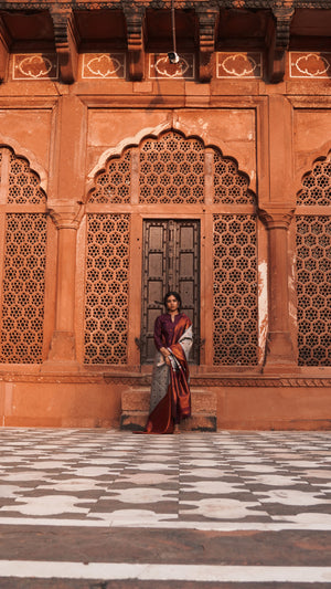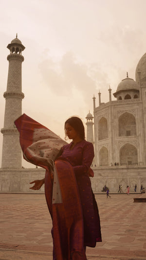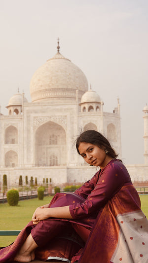 "Crafted from luxurious semi kanchipuram silk, this entire ensemble exudes elegance and charm, perfect for your special occasions. The unique and custom made colour palette of this suit set, the chic neckline plus the sleeves & the breathtaking tissue silk dupatta makes it a must-have for this festive season.