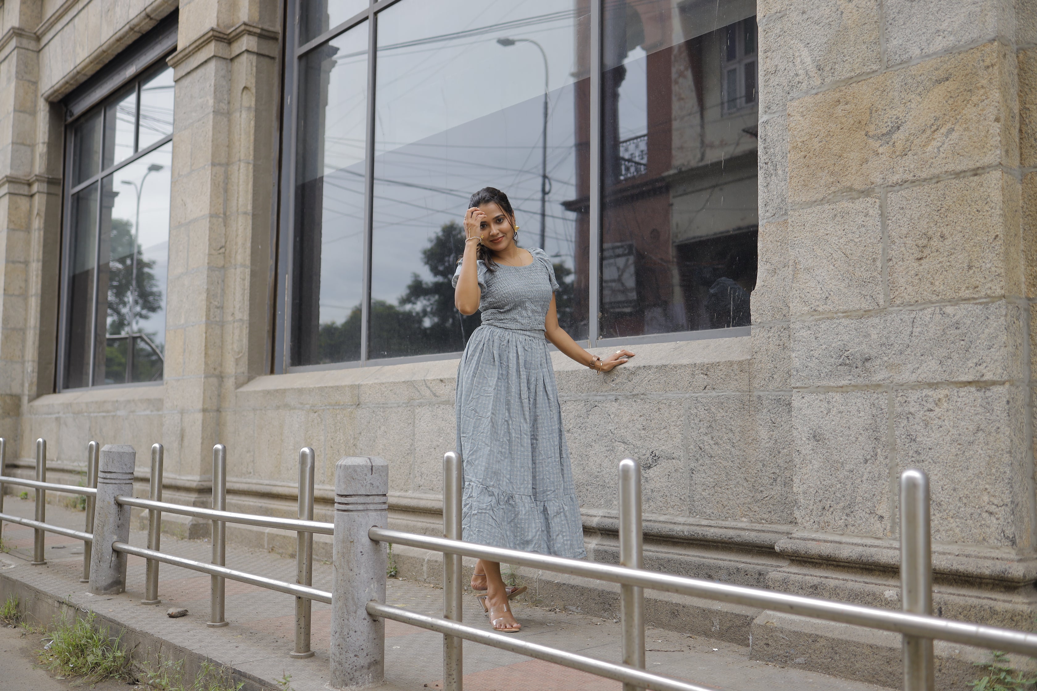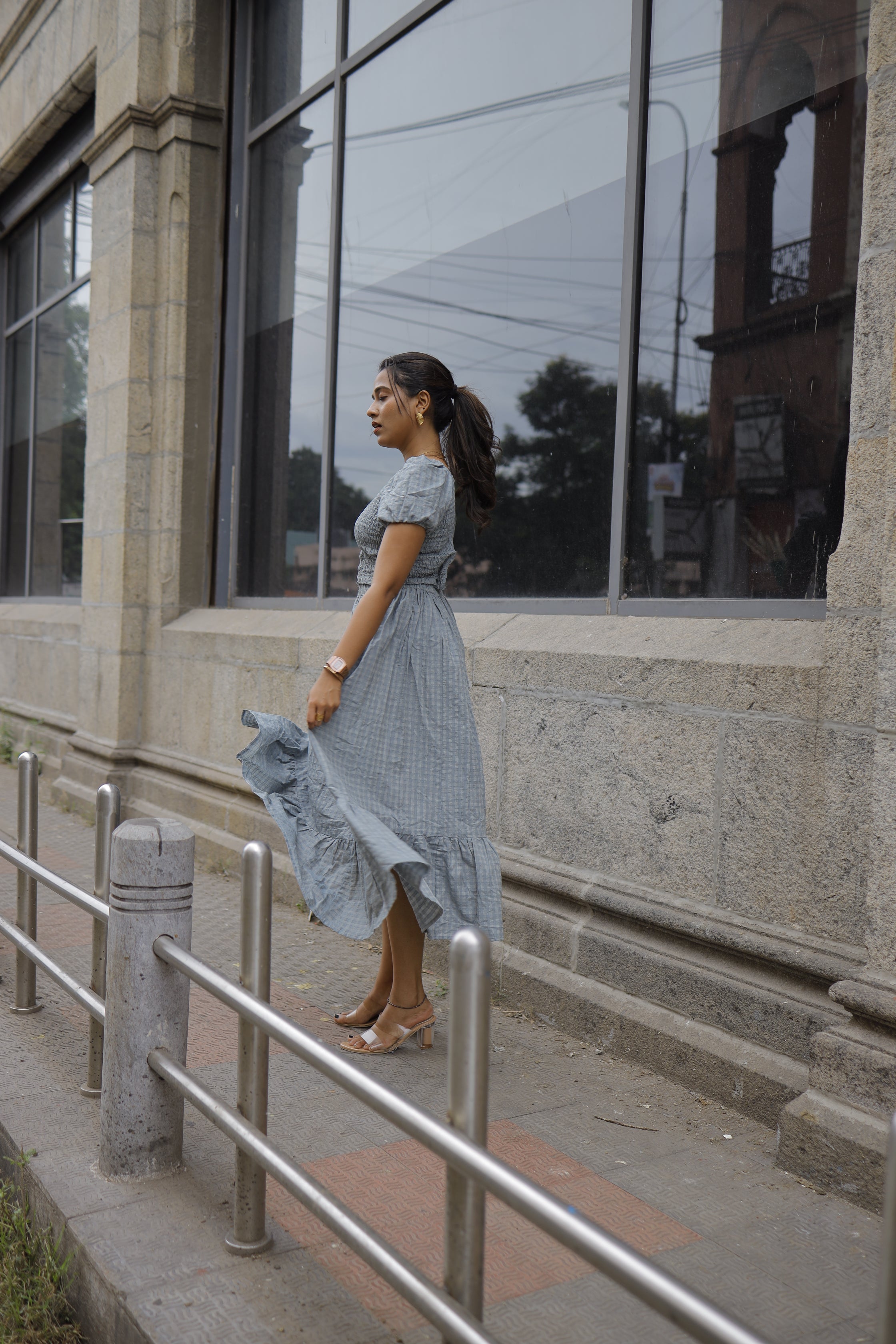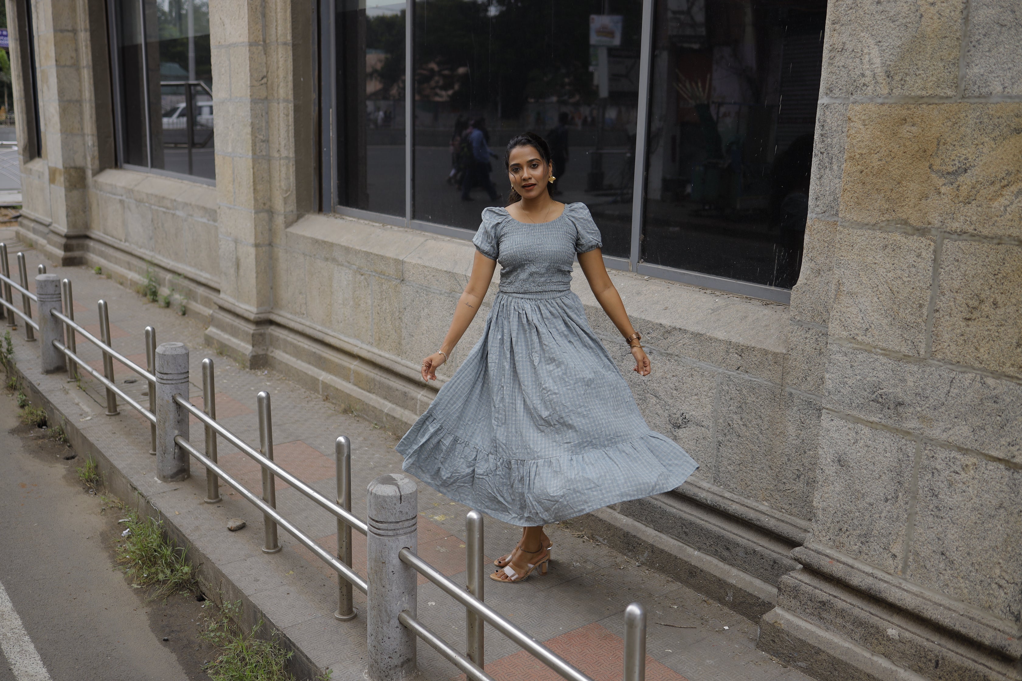Natasha ( grey ) - checked handloom cotton skirt set in grey