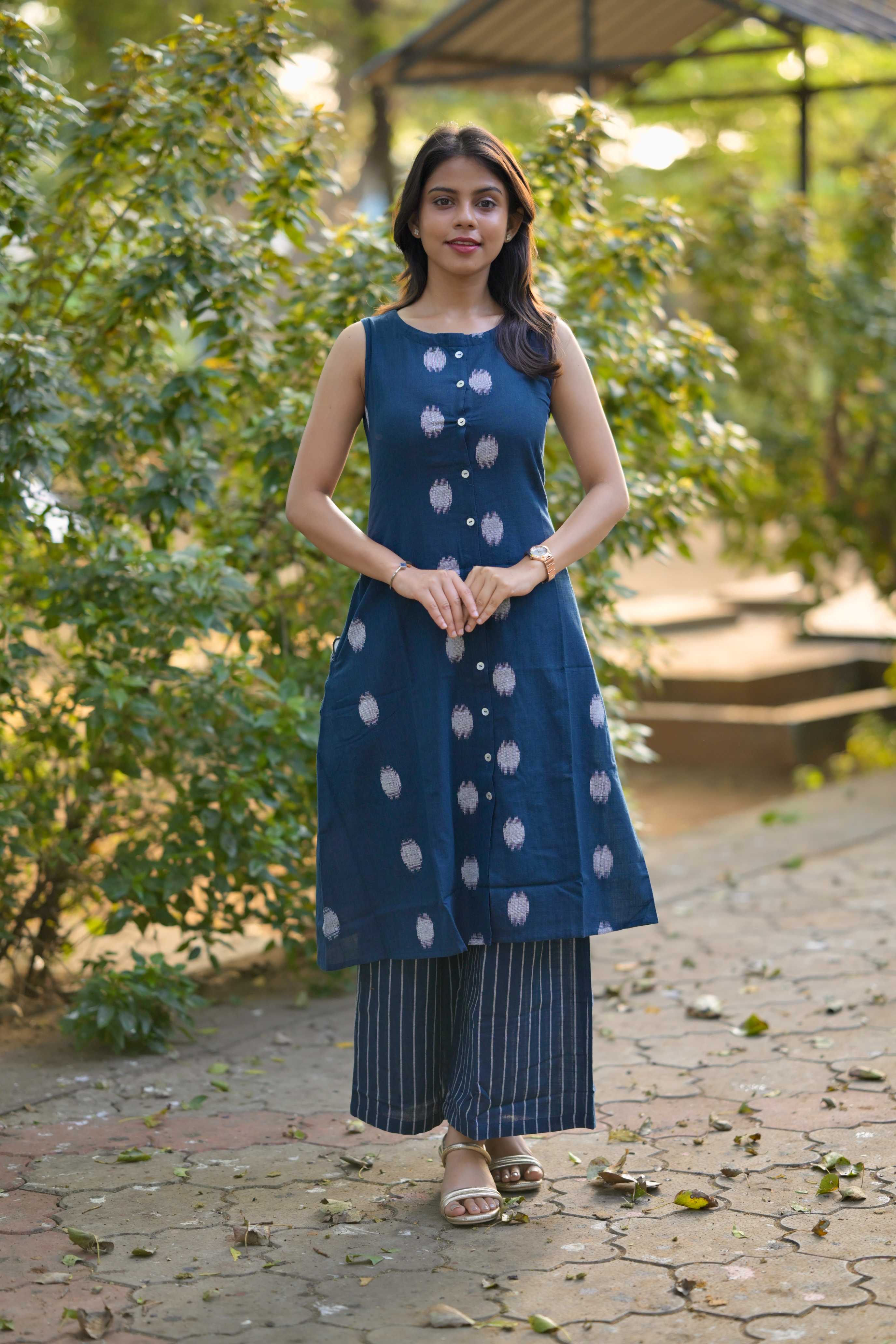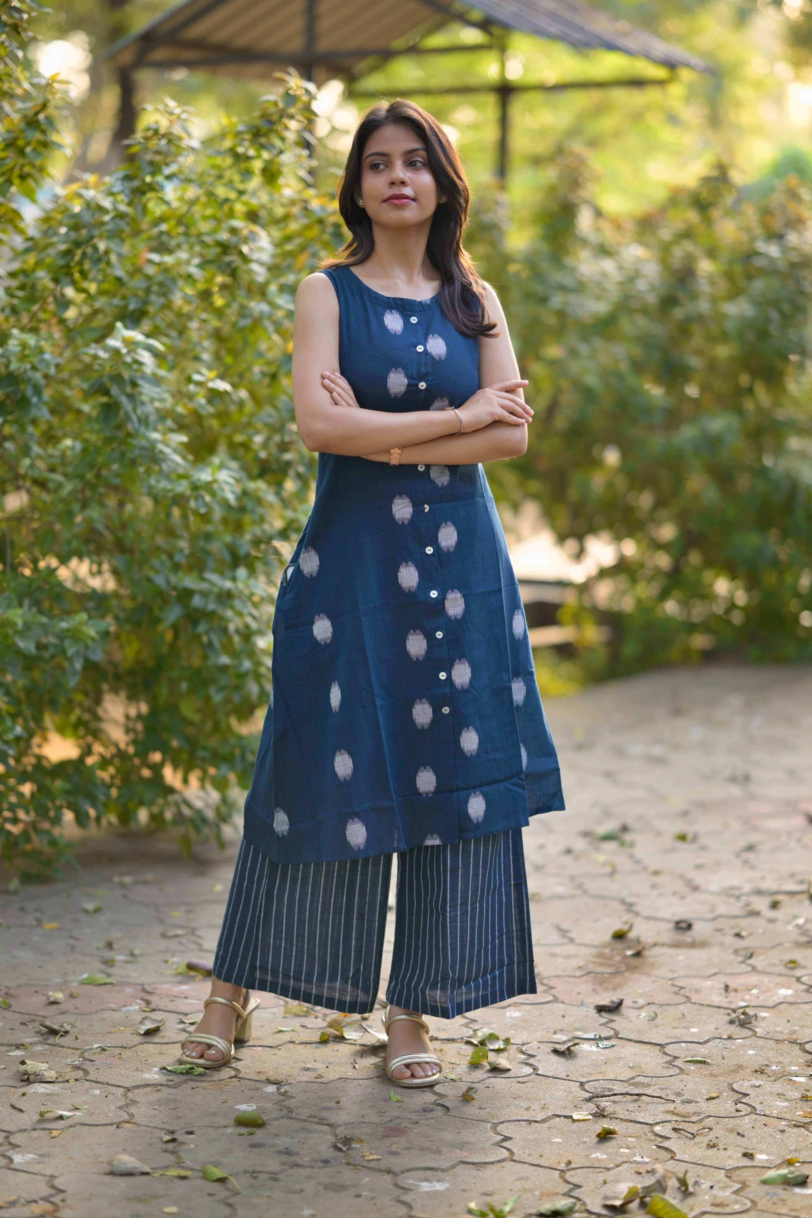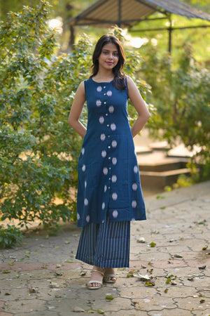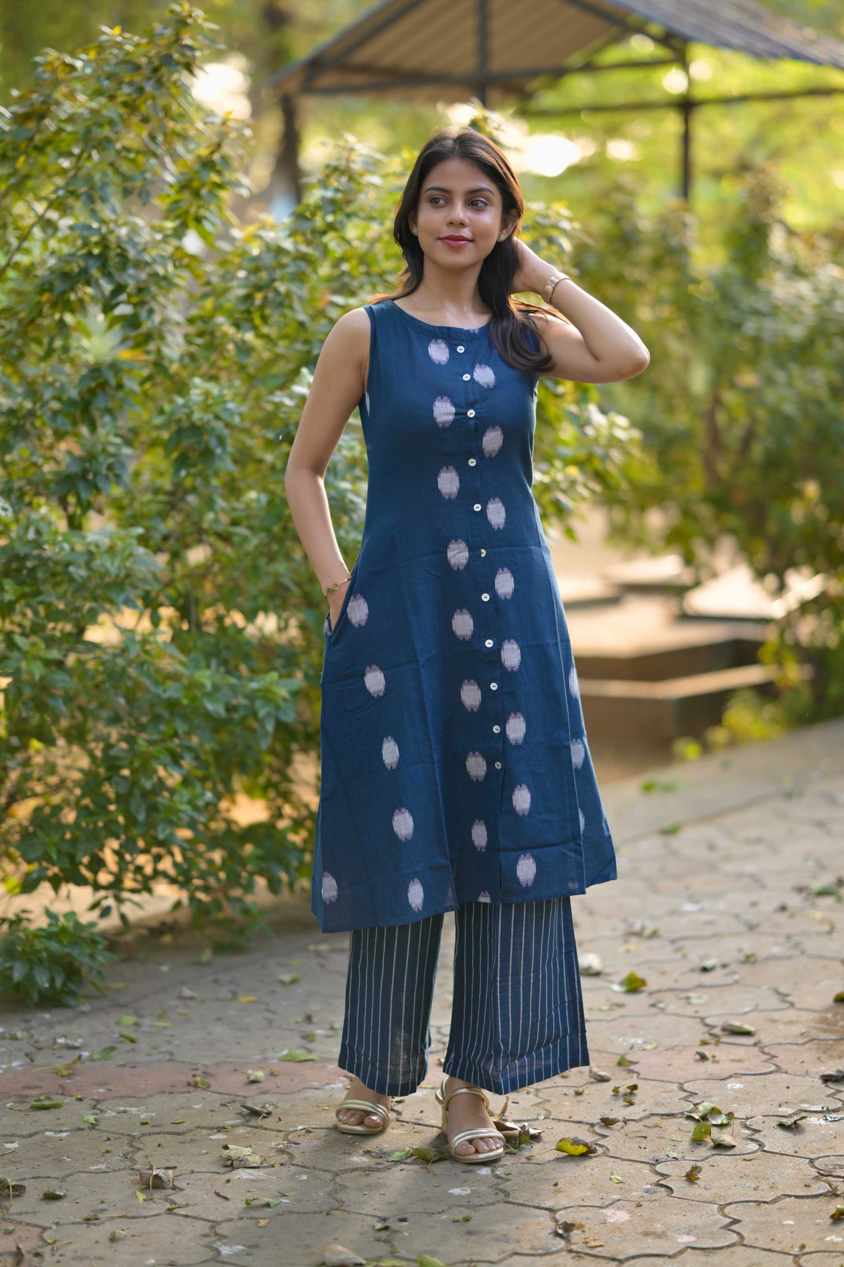 — Polka dot and stripes handwoven handloom cotton coord set in blue .Smart neckline, sleeveless kurta with attached 11 inch sleeves inside the kurta and kurta has pockets and matching trousers too. It has openable buttons to aid nursing moms.
