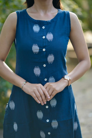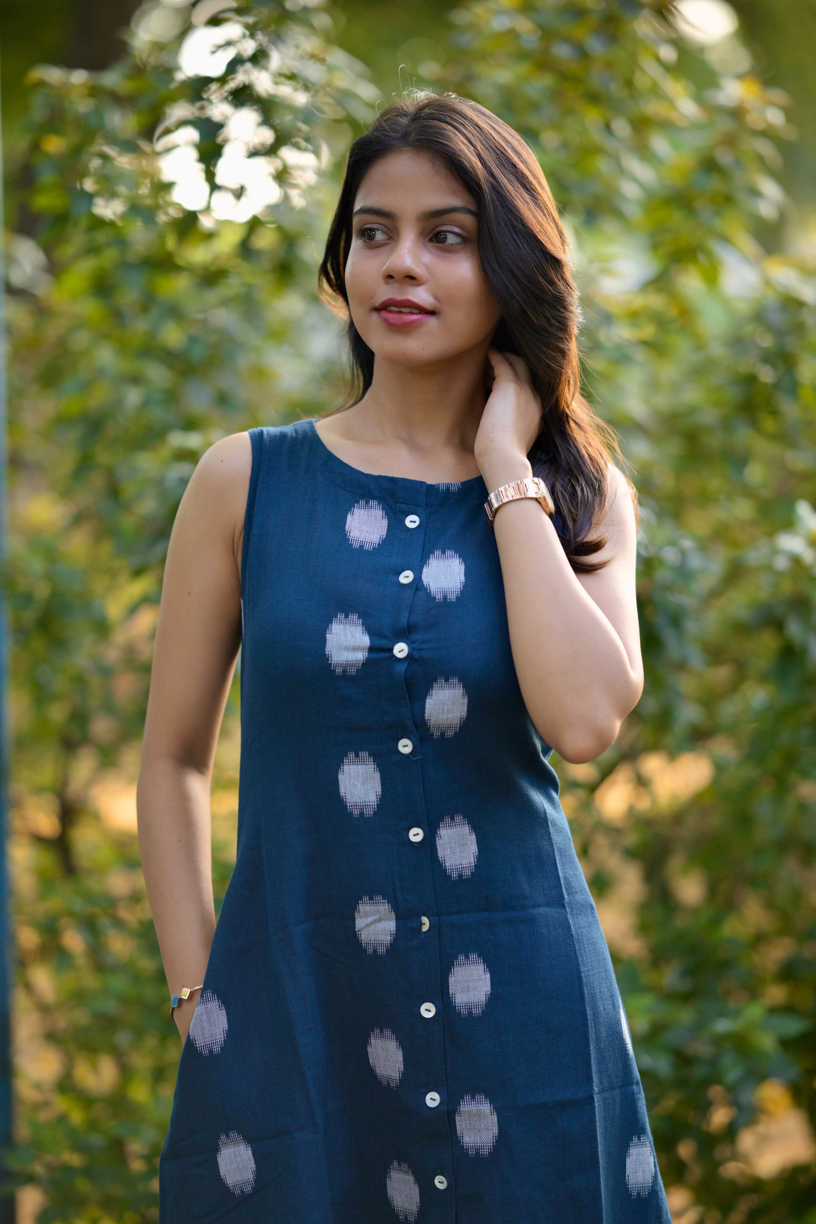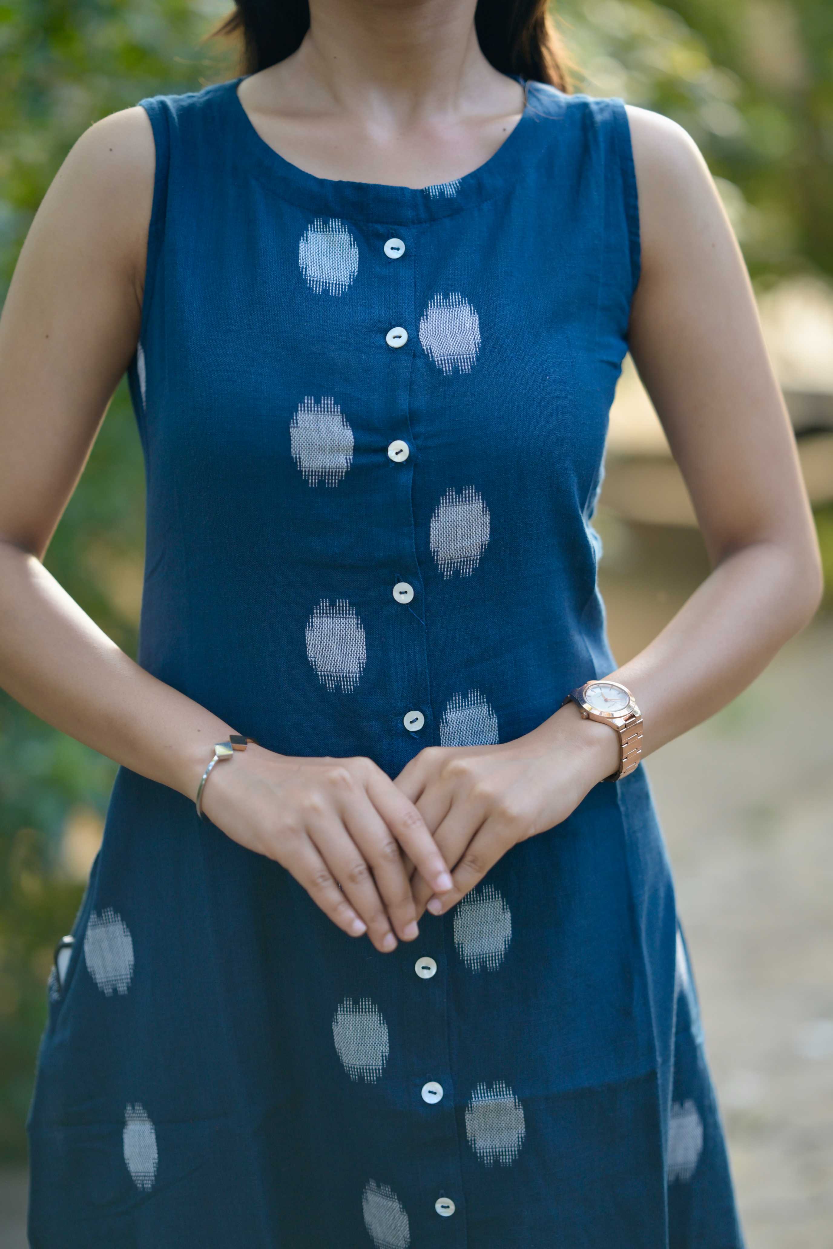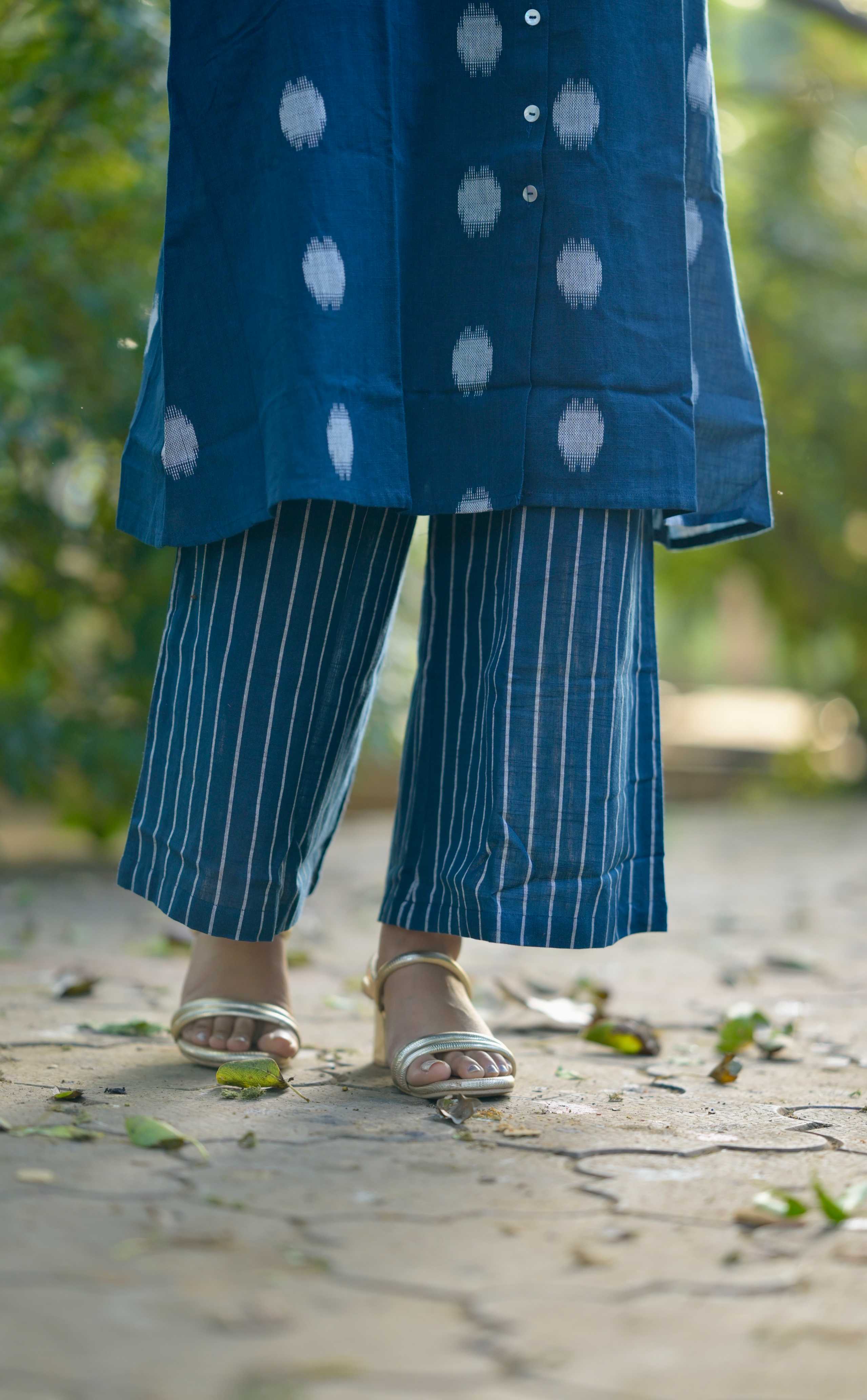 — Polka dot and stripes handwoven handloom cotton coord set in blue .Smart neckline, sleeveless kurta with attached 11 inch sleeves inside the kurta and kurta has pockets and matching trousers too. It has openable buttons to aid nursing moms.