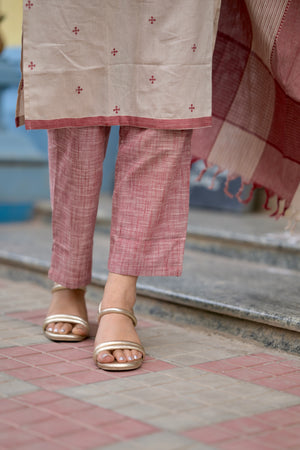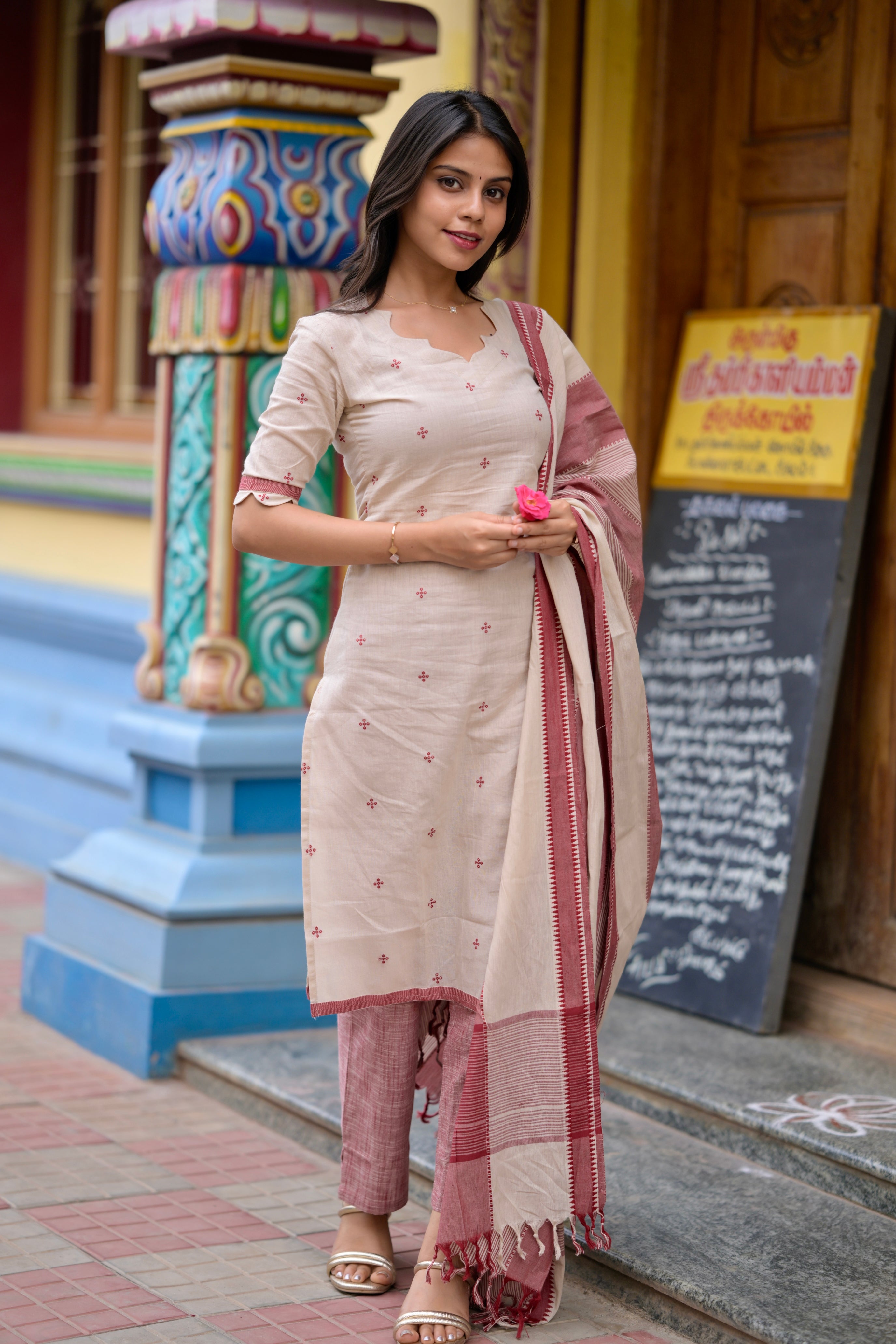 鈥� Handloom linen cotton kurta set in cream and maroon with smart neck detailing, sleeve detailing and comes with handloom linen cotton trousers with functional pockets and matching dupatta.