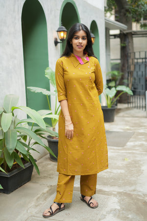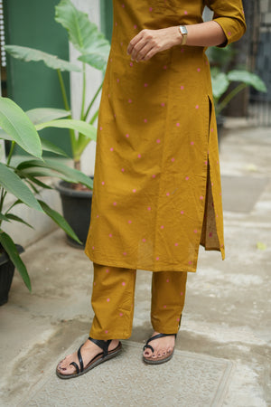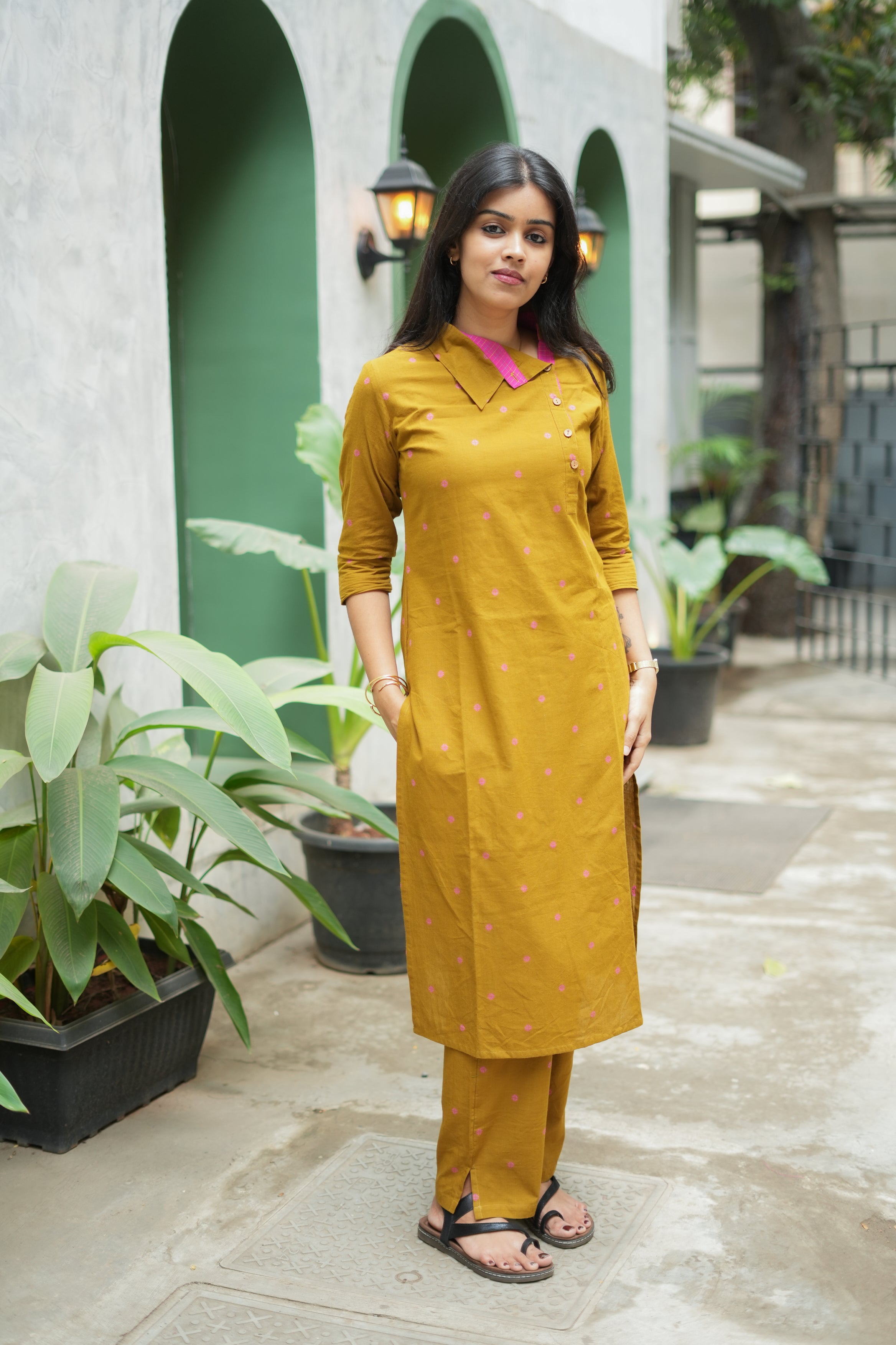 Pure handloom cotton kurta set in mustard yellow with a smart collar flap neckline with hand woven buttas all over, 3/4th sleeves and matching trousers with functional pockets.