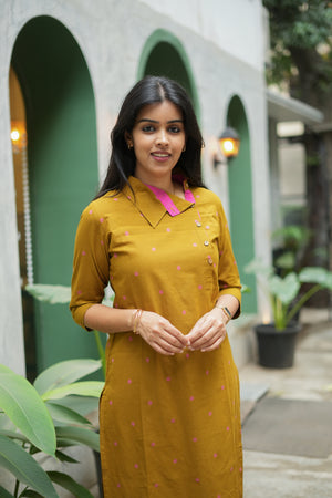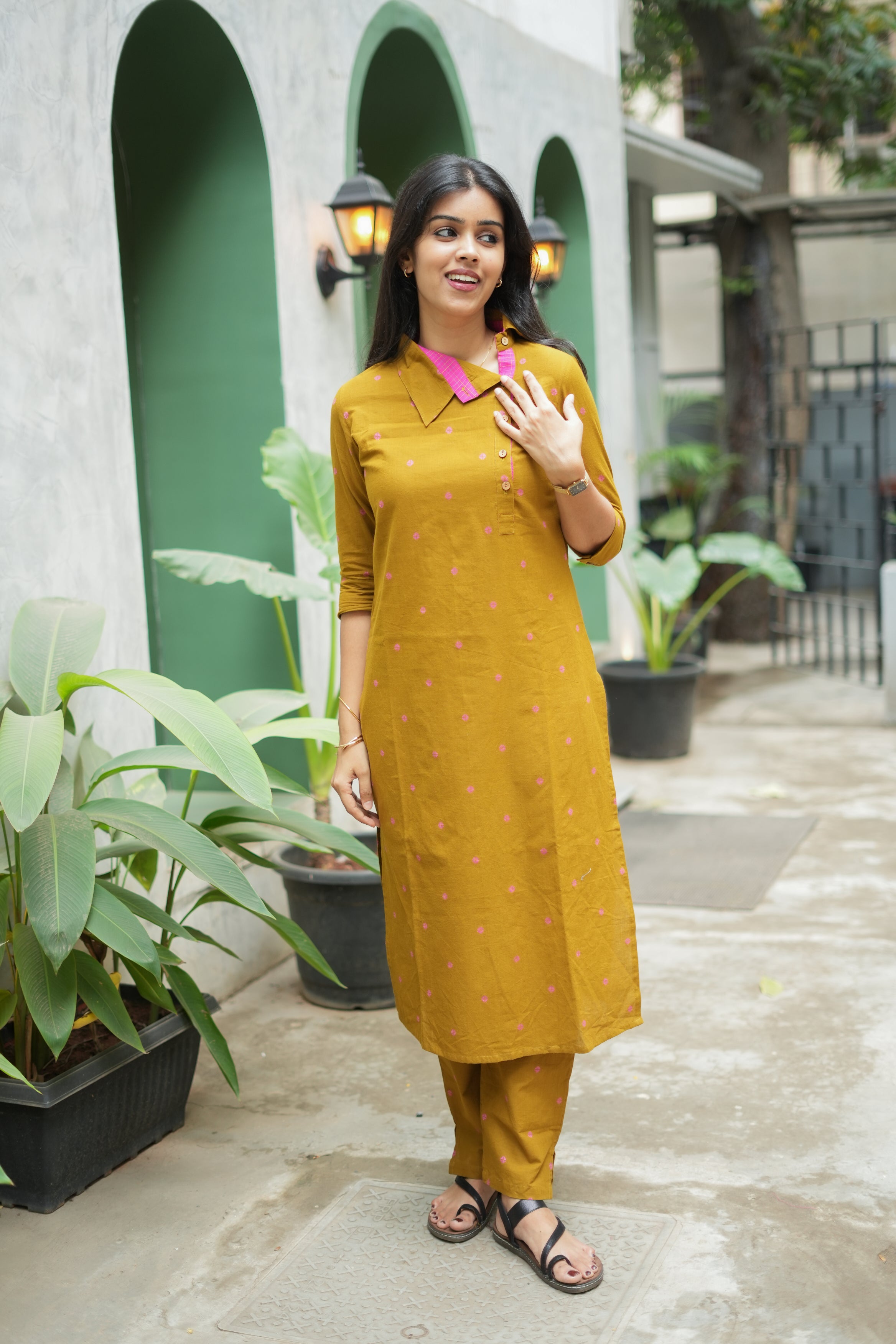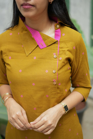 Saindhavi - handloom cotton kurta set in mustard yellow and pink