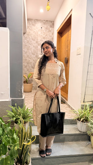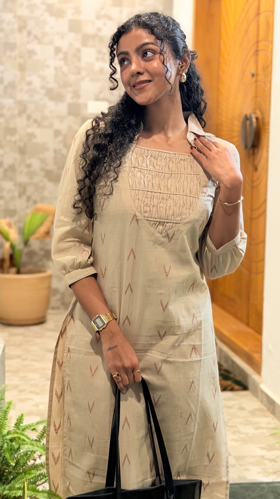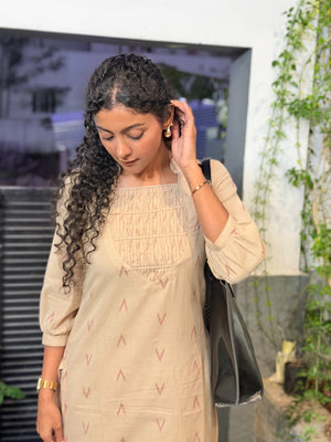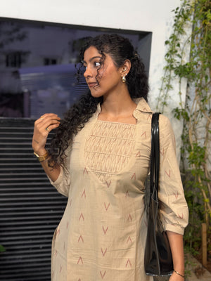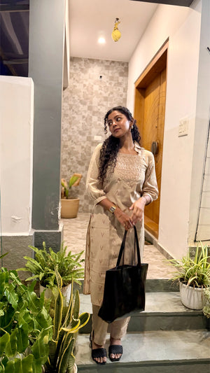 Pure handloom cotton hand woven cotton kurta set in beautiful biscoff colour with smart neckline and sleeves. Matching handloom cotton trousers with functional pockets too.