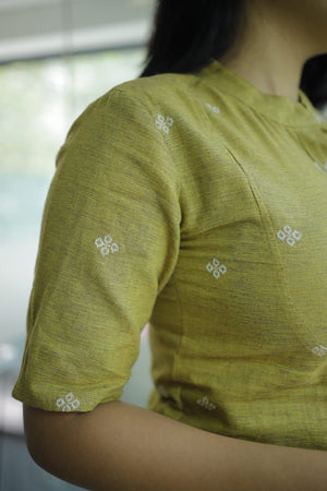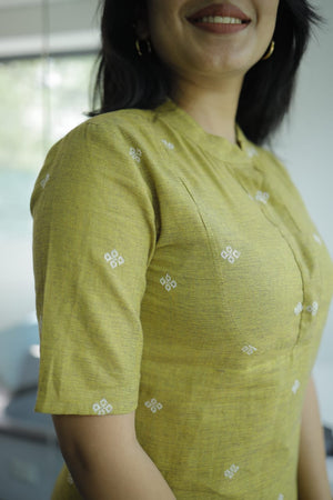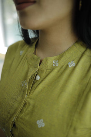 聽Leaf green handloom cotton kurta with a smart collar neck with a panel which has concealed buttons ( an addn feature to aid nursing moms )