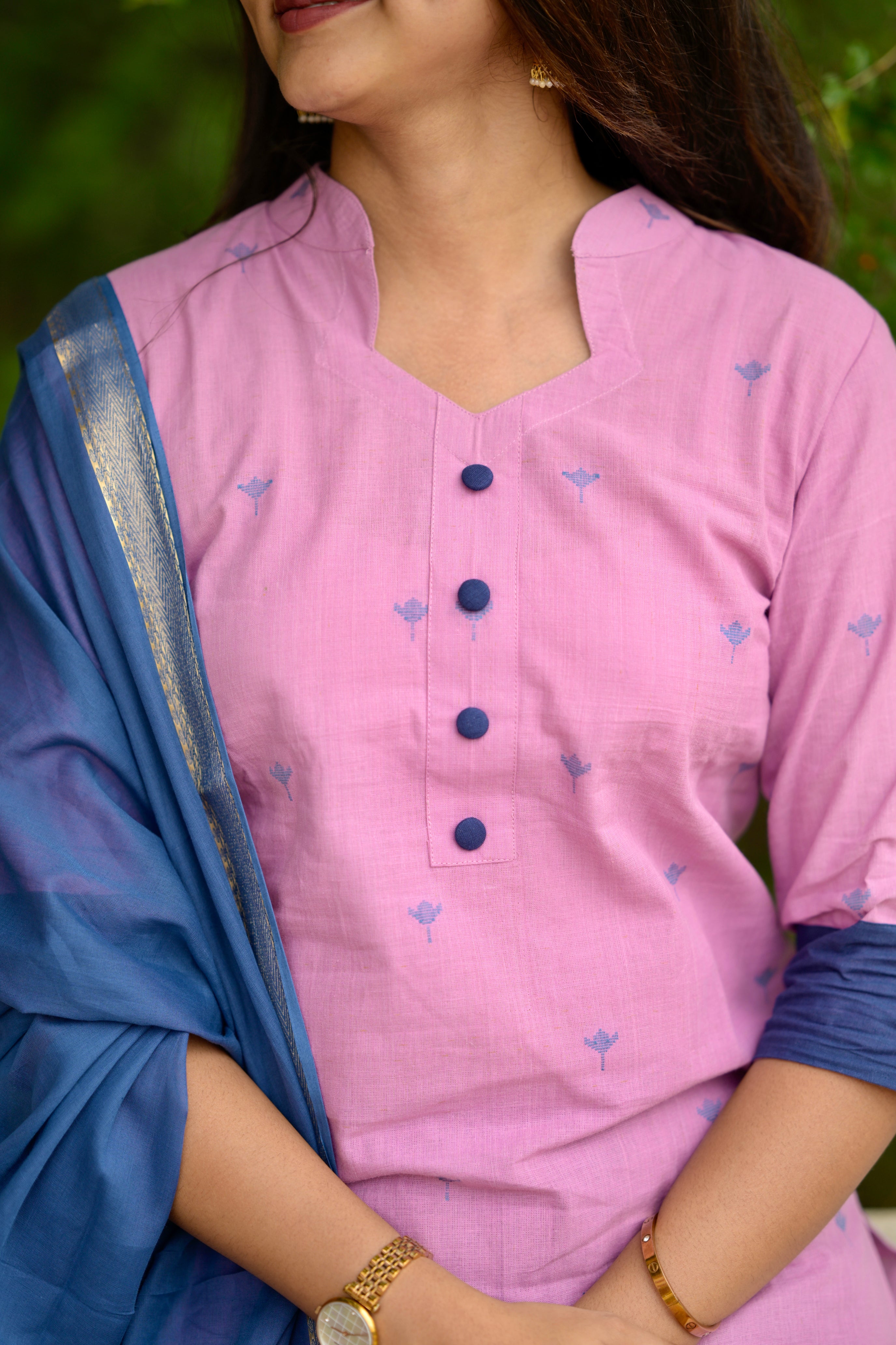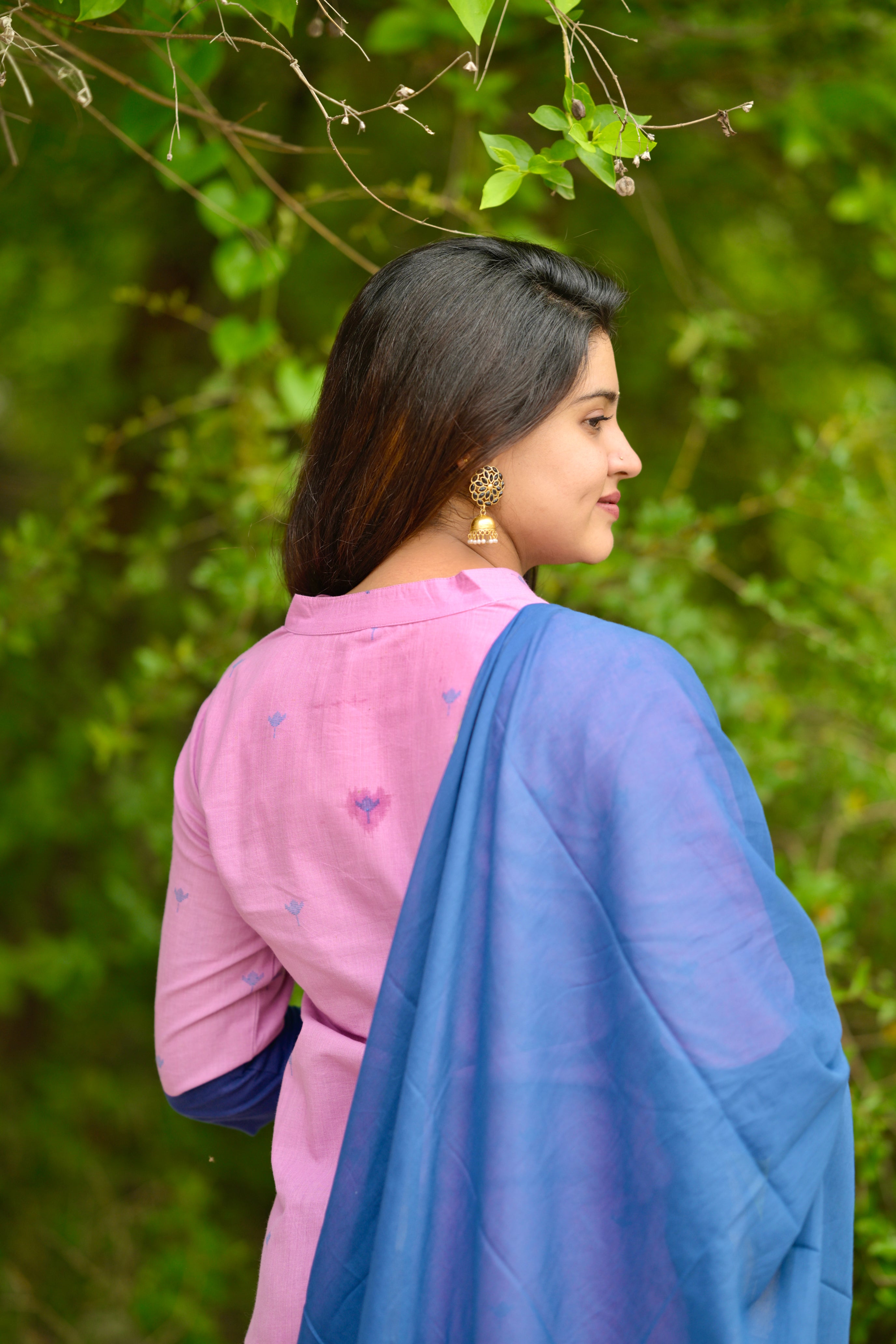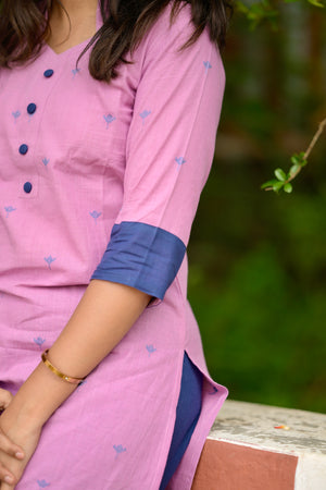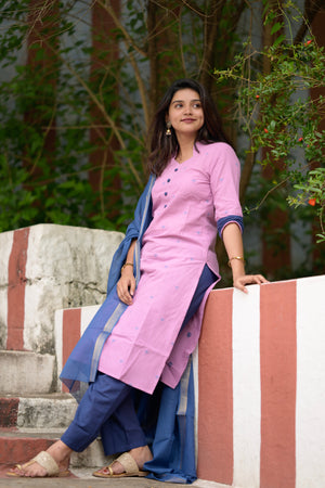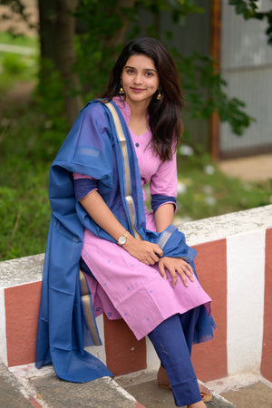Nithya (pink) - handloom cotton suit set in pink and blue with kota silk dupatta