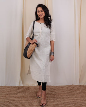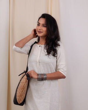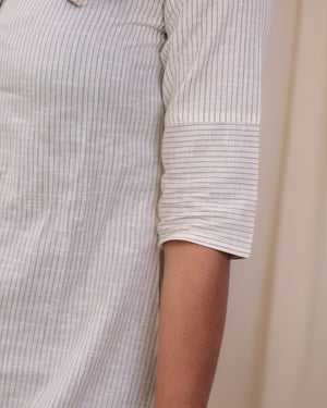 Striped hand loom cotton kurta win white and green with a smart neckline which has hooks closure, 3/4th sleeves, perfect for office / college.