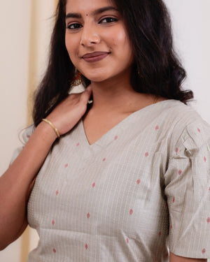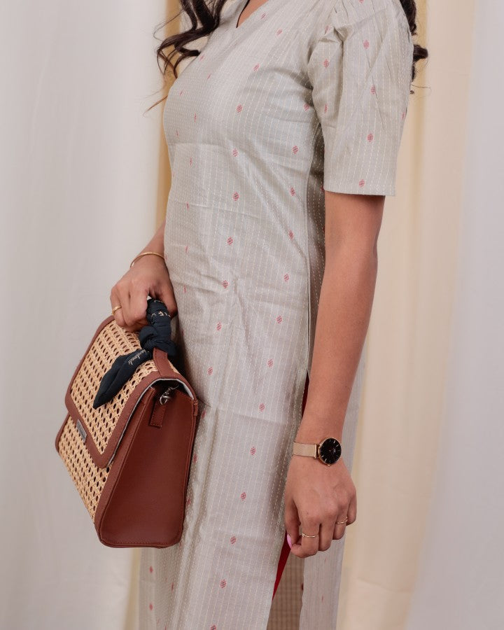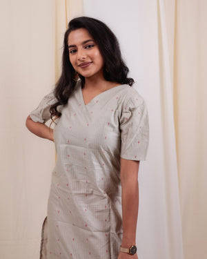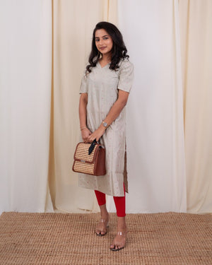 Chanderi silk kurti grey & red with a smart dramatic sleeves, V neckline, perfect for office / college.