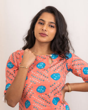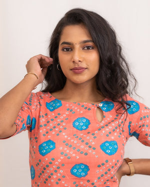 Pattern kurti 22 - Bandhani printed cotton kurti in peach & blue