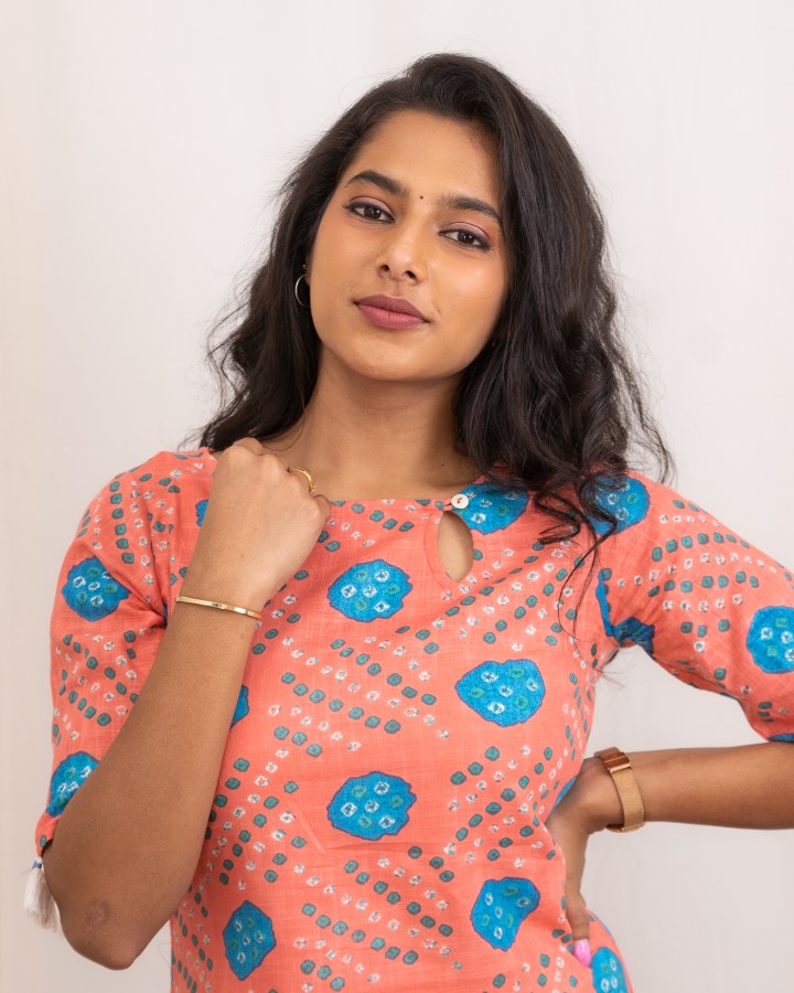Bandhani printed cotton kurti in peach & blue, smart neckline, smart sleeves with tassels detailing. Perfect for office/college.