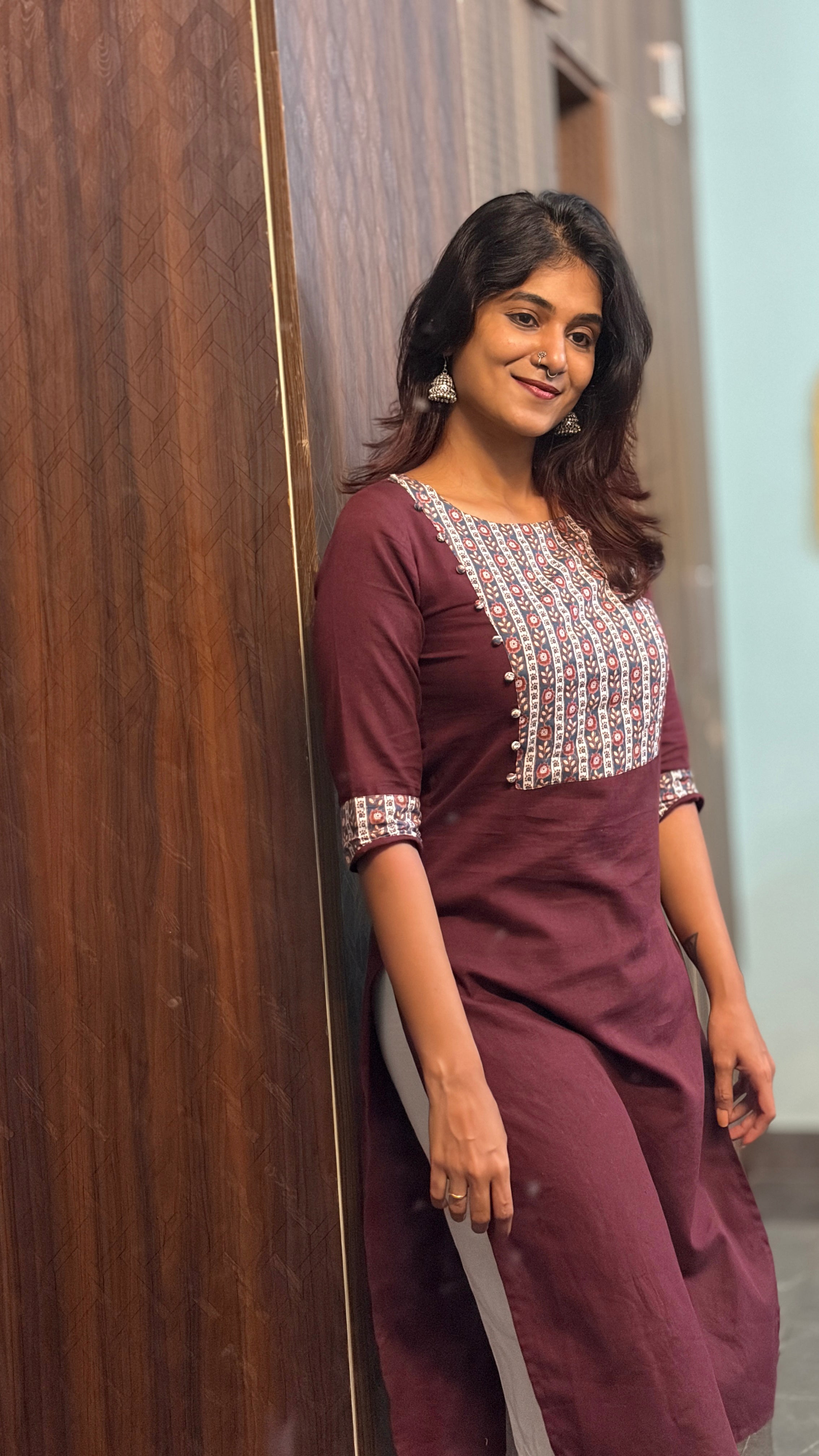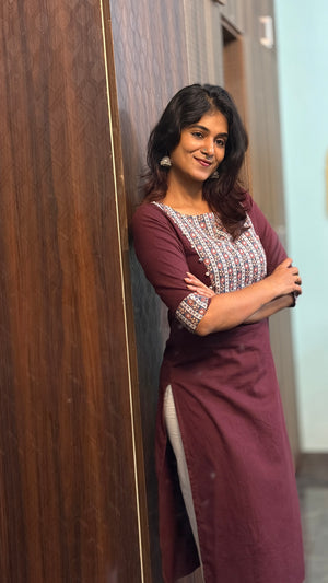 Handloom cotton kurti in maroon & white , 3/4th sleeves,with round neckline which is perfect for office/college.