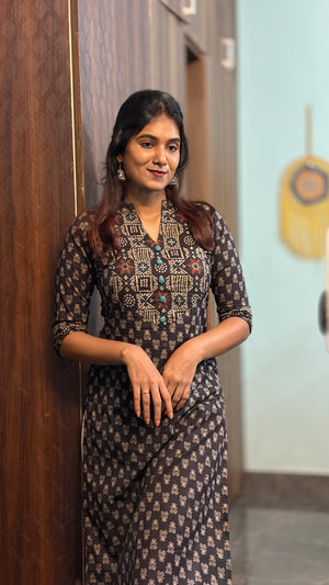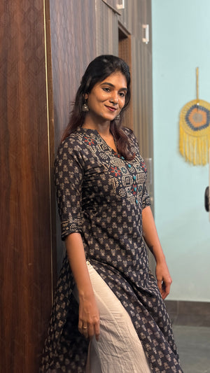 Handloom cotton kurti in black & white, 3/4th sleeves,with V neckline which is perfect for office/college.