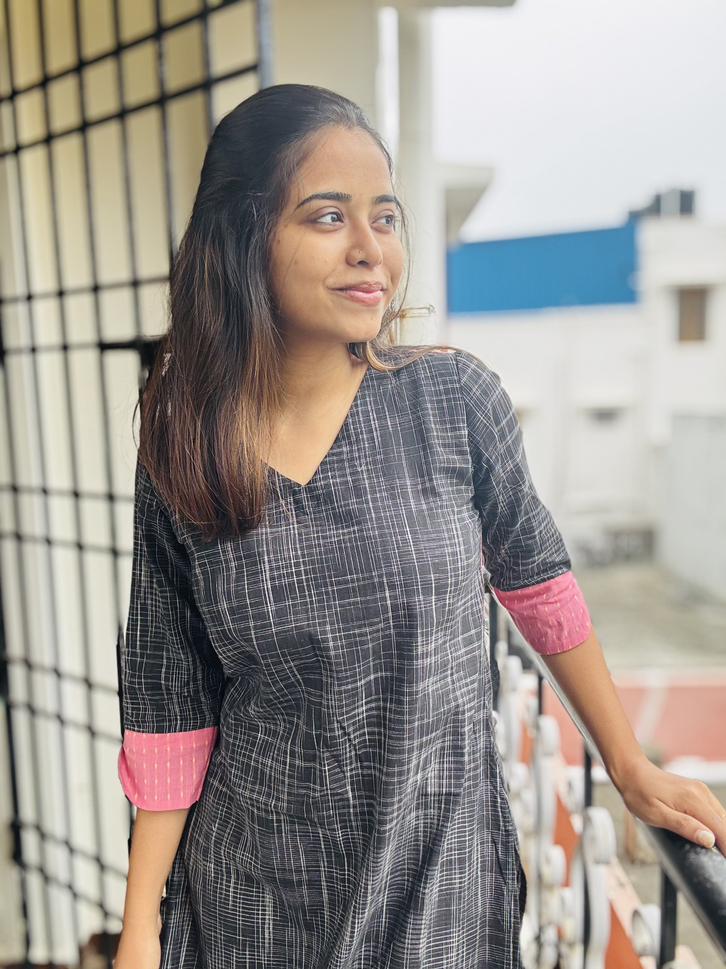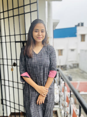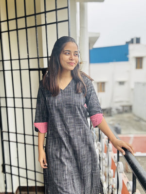 Handloom cotton kurti in black , 3/4th sleeves,with V neckline which is perfect for office/college.