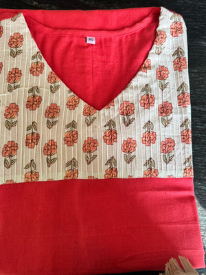 Handloom cotton kurti in red, 3/4th sleeves,with V neckline which is perfect for office/college.